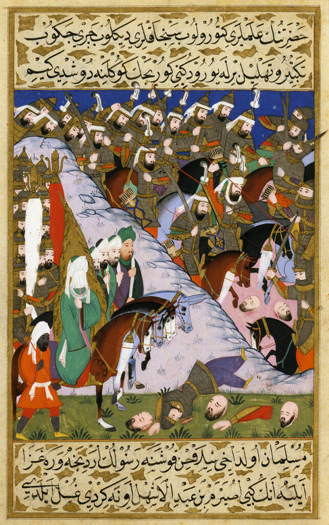 The Prophet Muhammad (veiled) and the Muslim army at the Battle of Uhud, folio from a Siyar-i Nabi; Istanbul, Turkey; c. 1595; 20.5 x 17.7 cm. Wikimedia Commons