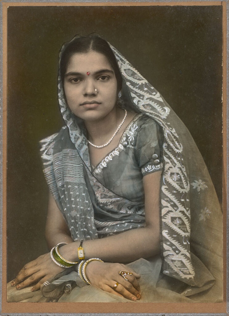 Untitled (portrait of a woman in grey sari and veil); India; 20th century; Gelatin silver print, hand coloured; 15 x 10.9 cm. The Cleveland Museum of Art, Ohio
