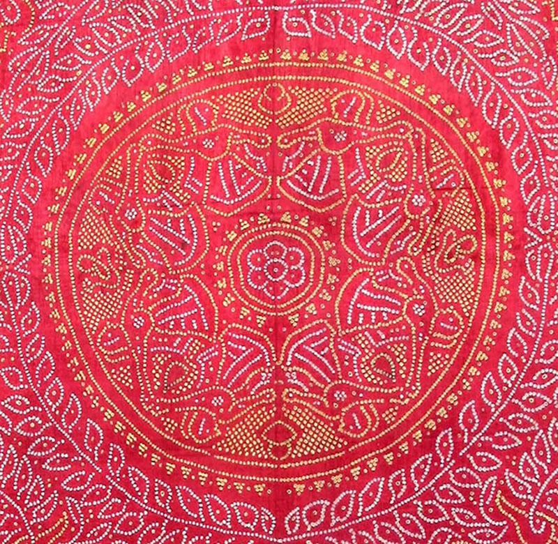 A traditional Gujarati design, commonly seen in bandhani silk saris, it depicts a circle of dancing women within a medallion setting, surrounded by floral and foliate motifs, and animals such as peacocks and elephants. The dense pattern is set in distinct borders, usually on a bright red ground. It derives its name from raas, the traditional Gujarati dance form.