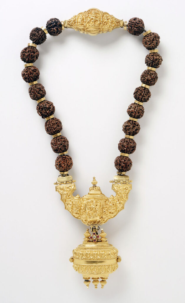 Necklace with Shiva's family; Tamil Nadu, India; Late 19th century; Rudraksha beads, repoussé and cast gold, inlaid with rubies and a diamond; 22.86 x 12.7 x 2.54 cm. Los Angeles County Museum of Art, California