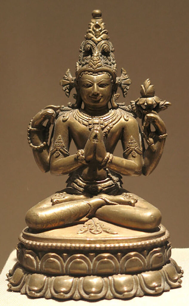 A form of the bodhisattva Avalokitesvara, the Shadakshari Lokeshvara is associated with Tibetan Buddhism. He is typically depicted in white with four arms. The principal hands are folded in the anjali mudra, while the remaining two hands hold a rosary and a lotus respectively.