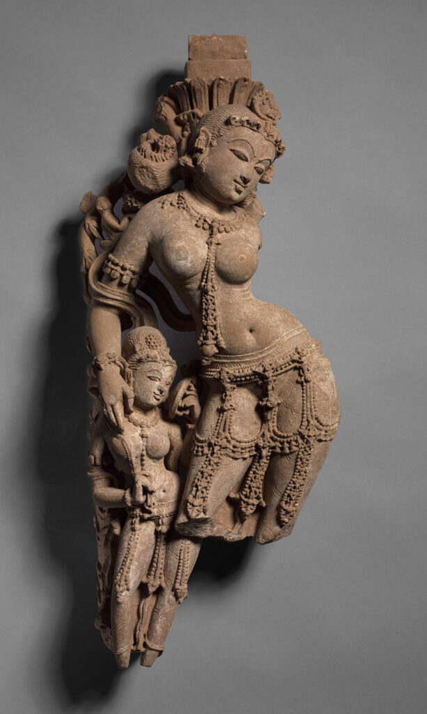 A prominent feature of Indian sculpture, it depicts a female deity with stylised and sometimes exaggerated feminine features, elaborate hairstyles and jewellery shown holding the branch of a tree, usually the sala tree, or standing near one. It is believed to have emerged from ancient Indian tree deities and signifying fertility. According to the Buddhist text Avadanasataka, the festival of salabhanjika parva was celebrated to mark the flowering of the sala tree. From the Sanskrit, meaning “breaking the branch of a sala tree”.