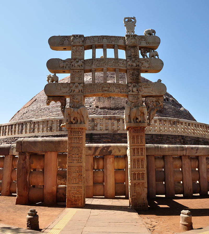A historical Buddhist site in present-day Madhya Pradesh and the site of stupa complexes such as the Great Stupa from the third century BCE. Patronised by the Mauryan emperor Ashoka as well as later dynasties such as the Satavahanas, the stupas at Sanchi are known for their intricate stone carvings, epigraphical records and pillars.