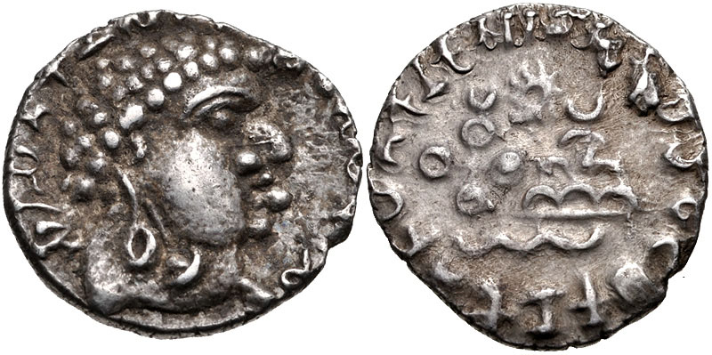 Coinage of Satavahana ruler Vasisthiputra Satakarni; Deccan, India; 118–147 CE; 1.7 cm. Photograph: CNG Coins (2016), Wikimedia Commons