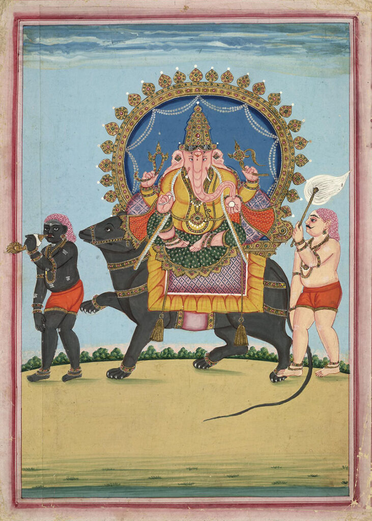 An animal that is typically the mount or vehicle of deities in the Hindu pantheon. As mounts, they are often depicted with their respective deities and constitute part of their iconography. Vahanas are also worshipped as standalone beings. Some popularly depicted vahanas are Ganesha’s rat, Indra’s elephant, Durga’s lion, Kartikeya’s peacock, Lakshmi’s owl and Saraswati’s swan. From the Sanskrit, meaning “mount” or “vehicle.”