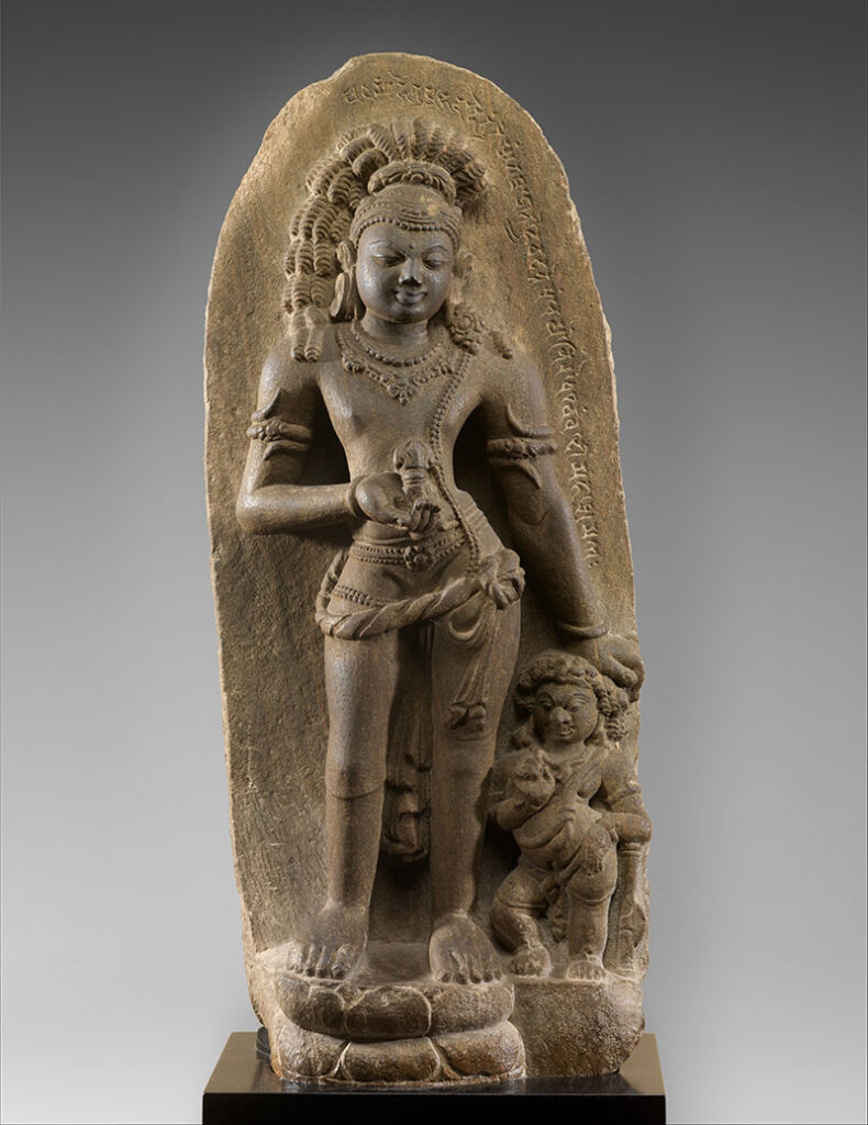 A bodhisattva from Mahayana Buddhism and the protector and guide of the Gautama Buddha as well as a manifestation of his power. He is considered one of the earliest of the three protective deities surrounding the Buddha and one of the major dharmapalas (protectors of dharma) in Mahayana Buddhism. The deity is manifested in two distinct ways — his human form, which is depicted with a vajra (weapon) in his right hand, and his dharmapala form, Acarya-Vajrapani, depicted with four heads, arms, legs and a third eye, and shown holding a bell and a lasso. He is depicted as a yidam (a manifested deity representing Buddhahood) in Vajrayana Buddhism, with multiple limbs, treading on demons or lying on snakes. He is also depicted in the yab-yum (primordial union) position with his consort. From the Sanskrit words vajra, meaning “thunderbolt” and pani, meaning “in hand.”