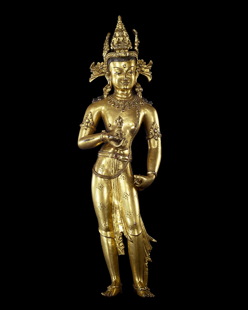 A bodhisattva in the Mahayana and Vajrayana traditions of Buddhism, he is primarily associated with the Akshobhya Buddha. Iconographically, he is white in color with a vajra or thunderbolt in his right hand and an upturned bell or ghanta in his left. Some sub-traditions of Buddhism regard him as the second patriarch of Buddhism after Vairochana Buddha. Within Tibetan Buddhism, rituals related to him are believed to purify the mind and soul.