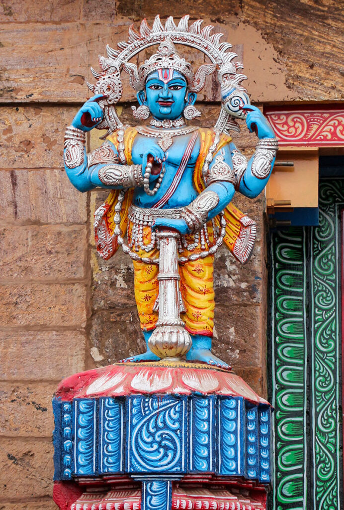 In Hindu religious mythology, he is an attendant of the deity Vishnu. Along with Jaya, he is a dvarapala or a dvarapalaka (gatekeeper) of Vaikuntha, Vishnu’s abode. The pair are frequently depicted at the doorways and entries of temples dedicated to Vishnu.