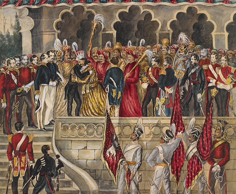 Durbar scene showing Wajid ‘Ali Shah embracing the Governor-General, Lord Hardinge; Lucknow, India ; c.1847. The British Library, Add.Or.742