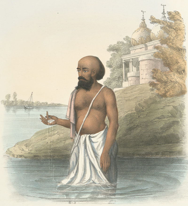 A sacred thread worn over the left shoulder and crosswise over the torso, which symbolises a Hindu rite of initiation into a stage of learning. This rite is limited to males of the Brahmin, Kshatriya and Vaishya varnas (social classes) of Hindu society and the thread itself is considered a marker of caste. Within Indian iconography, it is also appears in religious sculptures and paintings.