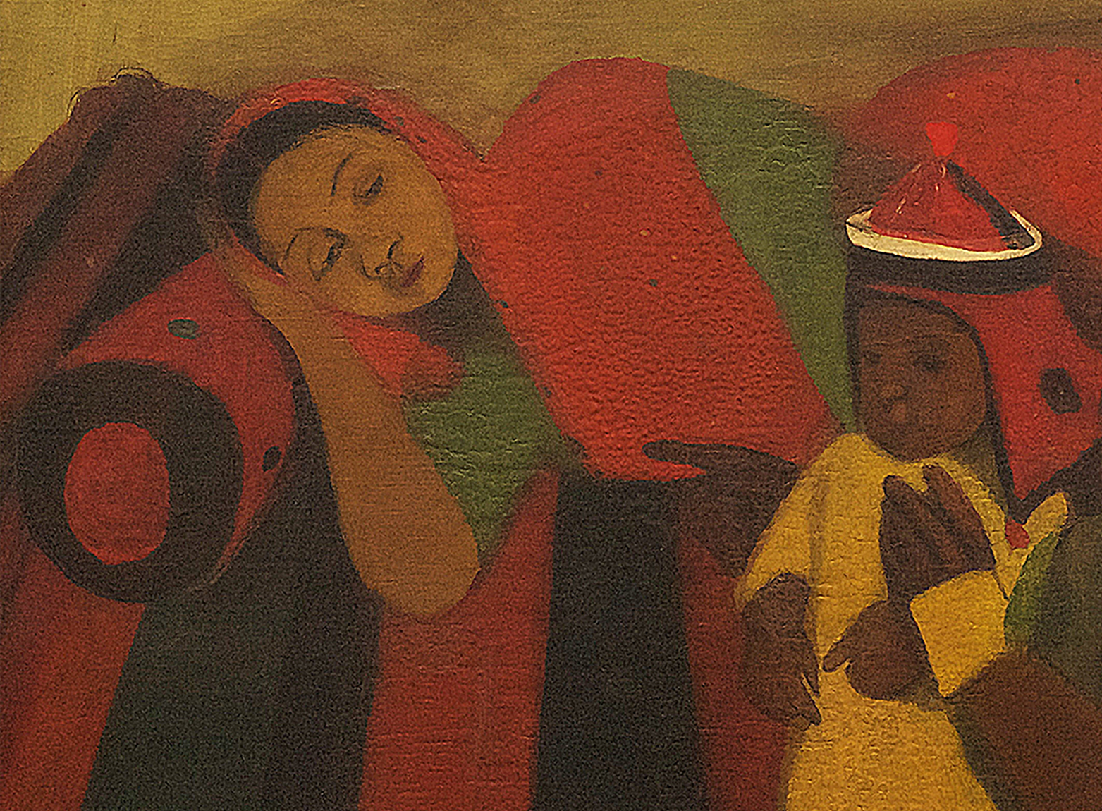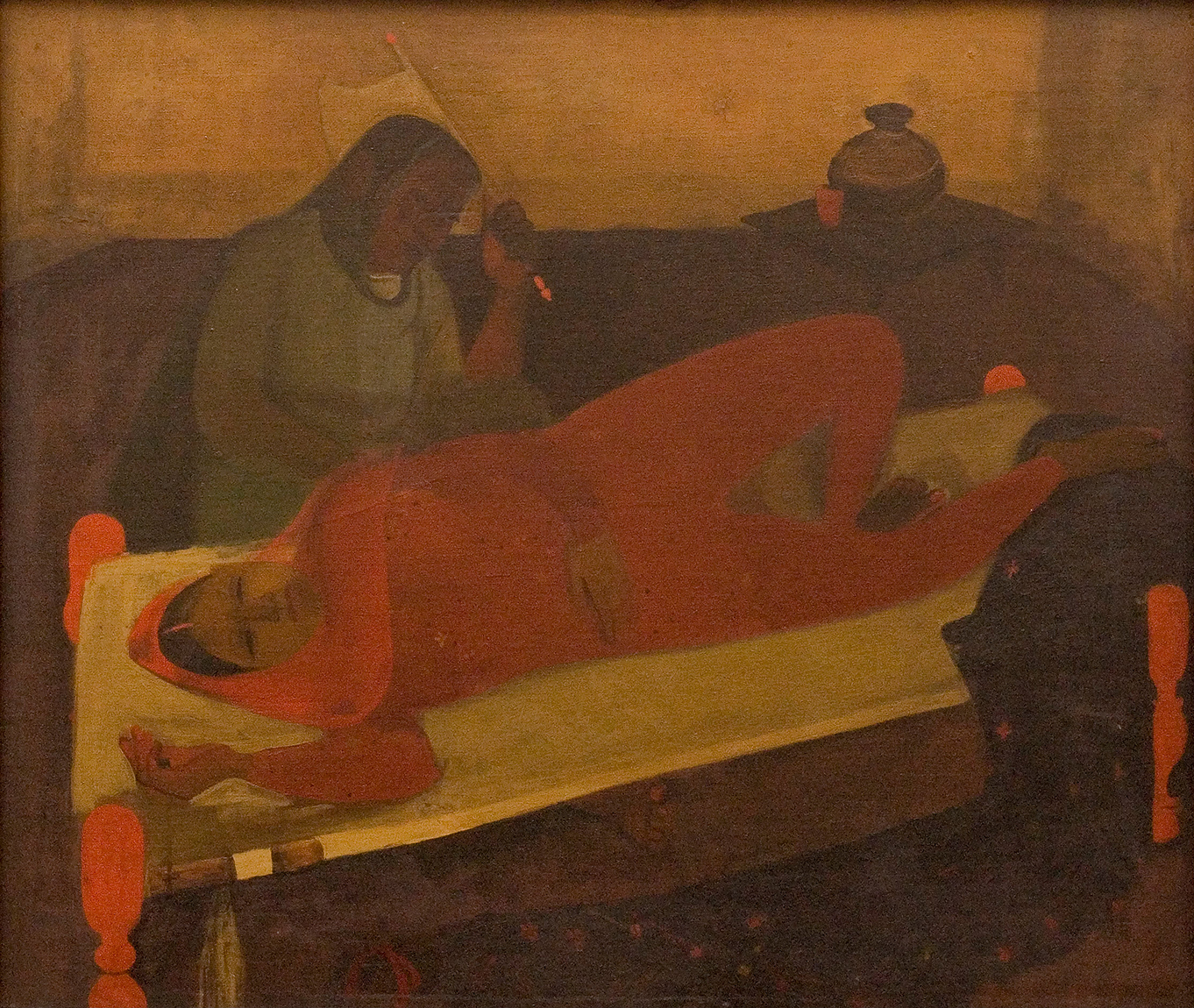 While much of her work that examines corporeality and the body is grounded in self-portraiture, in this painting the artist represents her younger sister Indira in the nude. She appears vulnerable in a way that Sher-Gil’s representations of herself often are not.