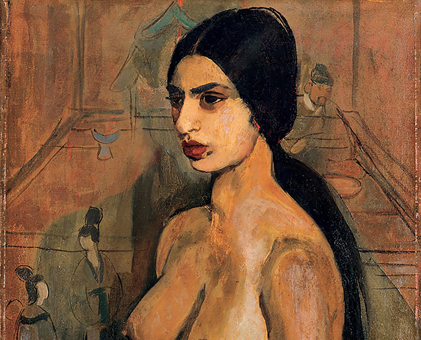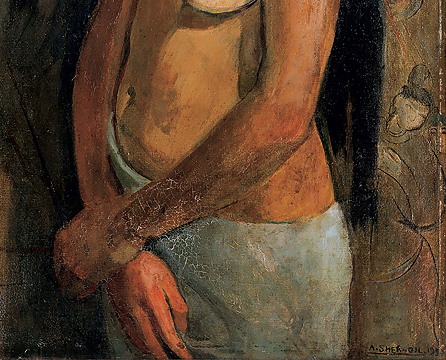 Depicting herself in the nude, Sher-Gil’s pensive self-portrait looks beyond the frame of the picture. Her long black hair is tied loosely, flowing down the length of her back.
