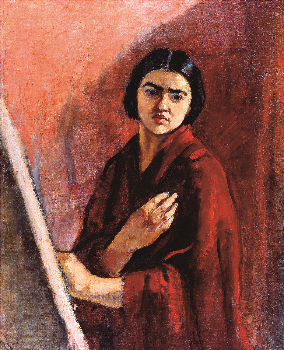 We see her academic training reflected in the under-studied painting Self-Portrait with Easel (1930), which she painted in her second year in Paris. With this work, she succeeds in fashioning herself as a serious artist, even though she is depicted without any artists’ tools and her draped red clothing seems too elegant for the messy work of painting.