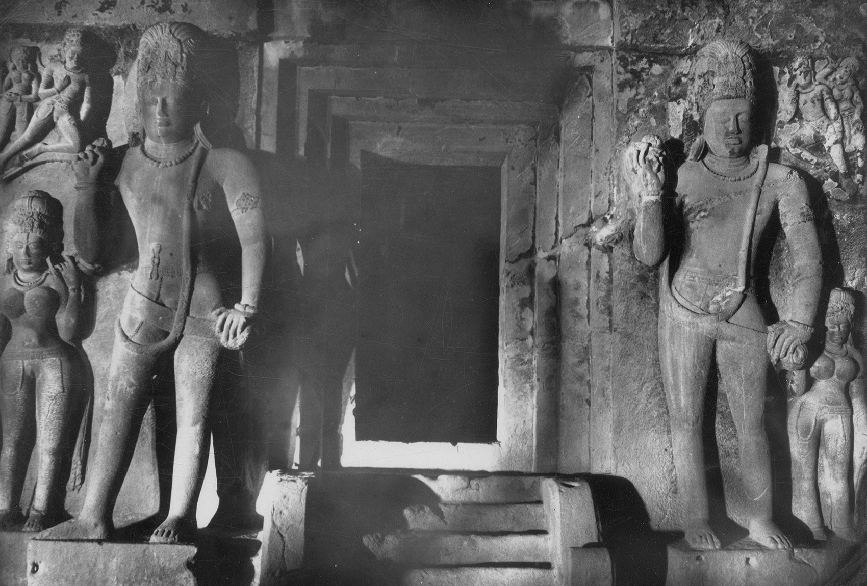 From the maha-mandapa, one moves further inward towards another pillared space, known as the ardha-mandapa, with two more dvarapalas guarding its entrance.