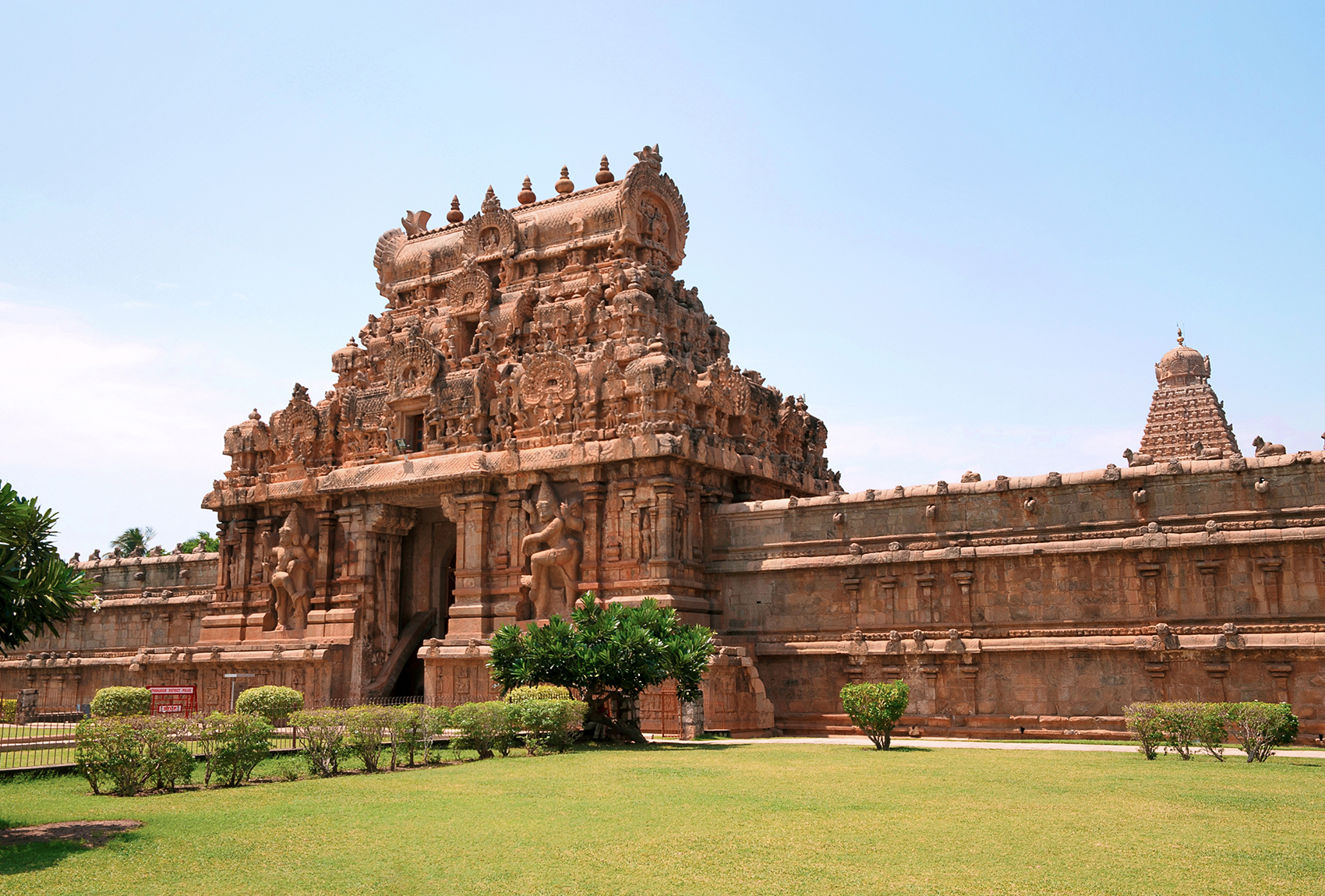 The Rajarajeshvaram Temple at Thanjavur in Tamil Nadu, also known as the Brihadishwara Temple, towers over its surrounding landscape — its central spire reaches 66 metres into the sky.