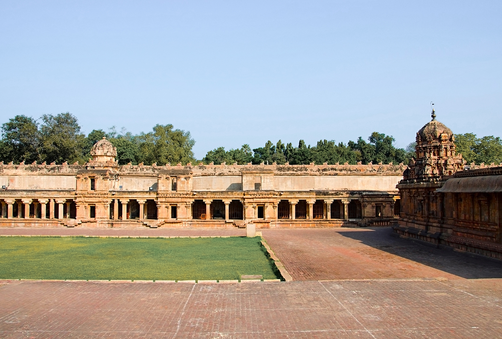 Like most Hindu temples, the Rajarajeshvaram is approached from the east and arranged along the east-west axis. A visitor moving towards the temple enters through a small brick and mortar gateway – a Maratha-era (late seventeenth-early eighteenth century) addition – to arrive at the compound.
