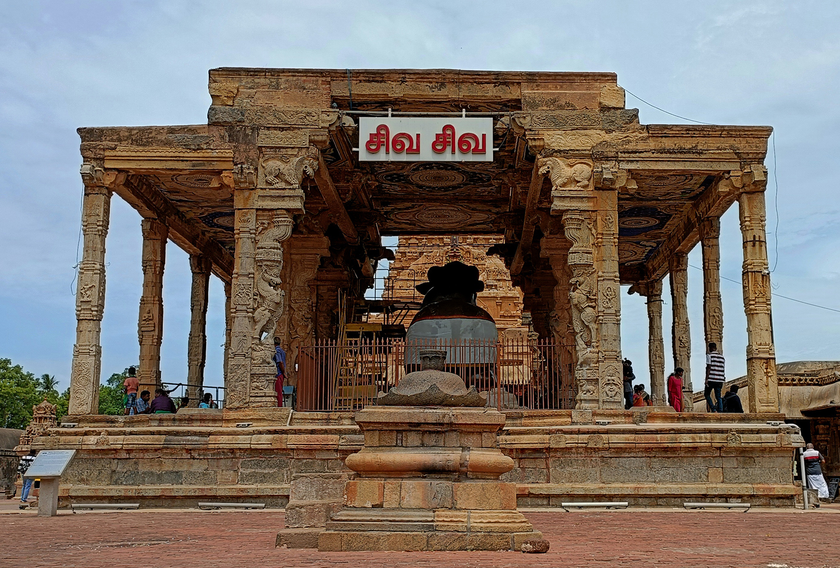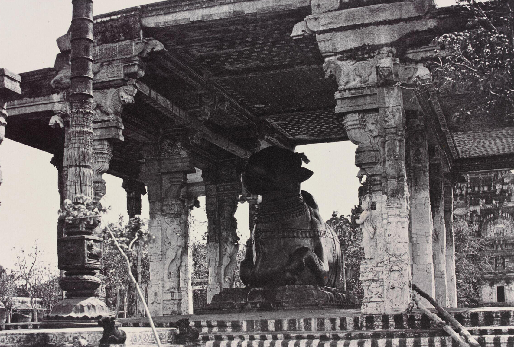 The most noticeable structure is an open, pillared pavilion that houses a 12-foot-high monolithic statue of Nandi, Shiva’s mount. It has its back to the viewer, and its face is pointed toward the deity, and the main shrine, demonstrating a single-point focus on the deity that it models for pilgrims visiting the temple.