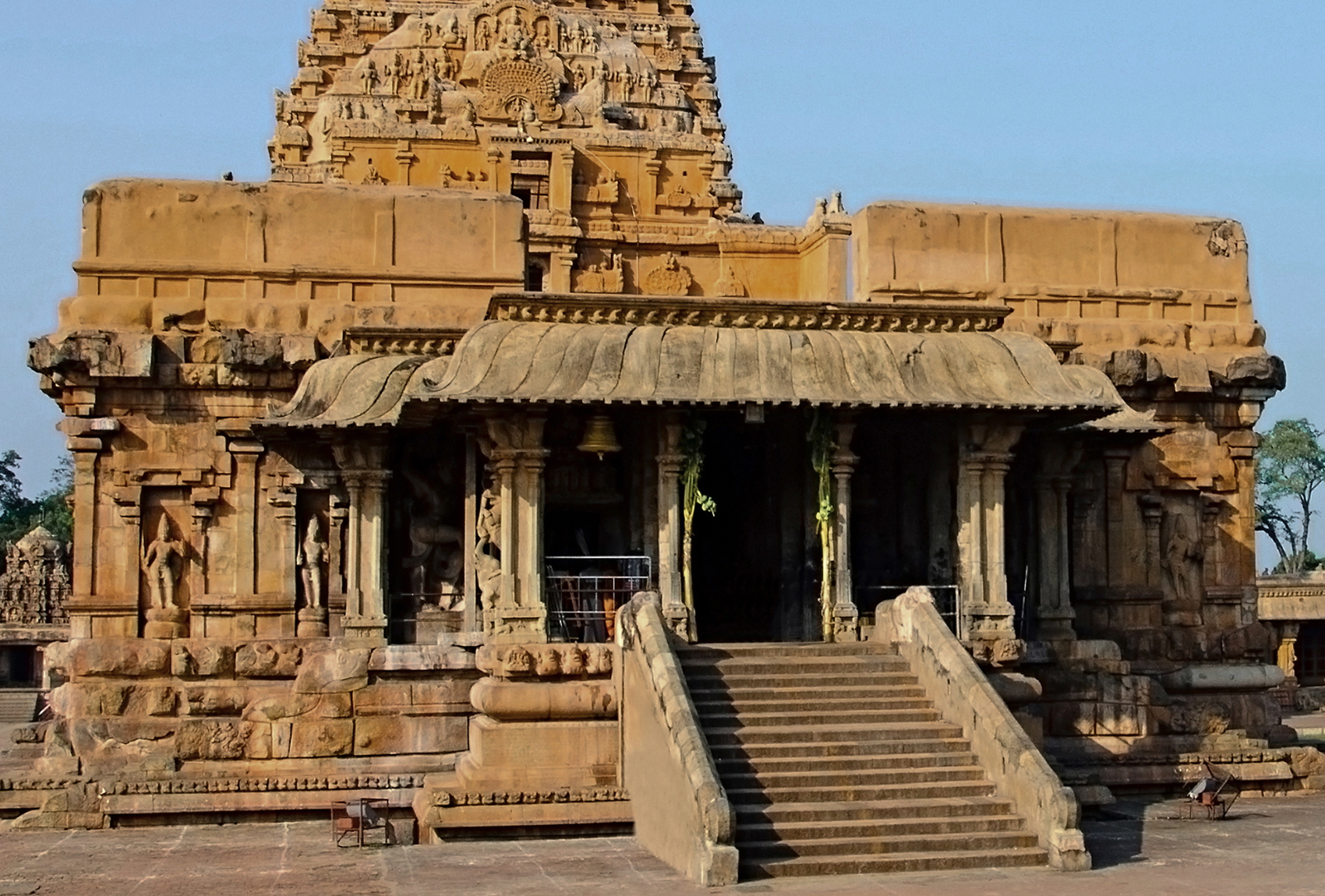 At the very top of the stairs is a small pillared portico. This is the mukha-mandapa, serving as a porch area that leads to the inner parts of the temple. The pillars, roof and the stairs of this mandapa are all later additions, built during the Nayaka era.