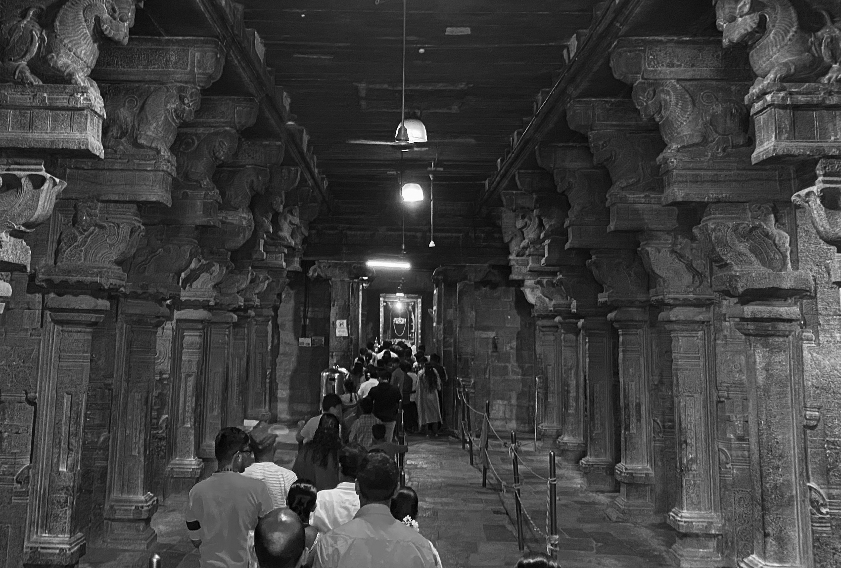 From inside the mandapa is a long hall, with two rows of ten pillars placed on raised platforms on each side. The pillars visible today are Nayaka-period additions. The space historically hosted religious gatherings, cultural performances and rituals.