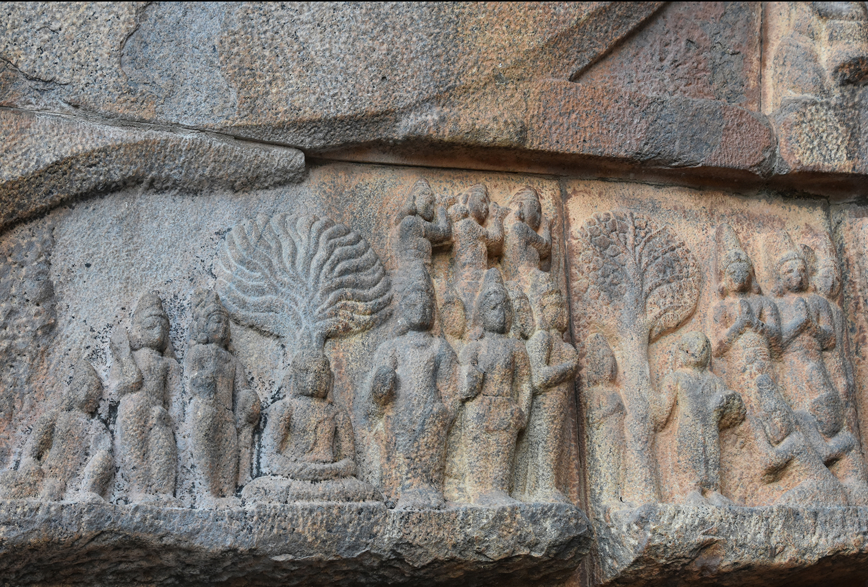 The parapet along the southern staircase that Rajendra Chola I must have climbed on his way to the main shrine is covered in engravings of the Buddha under a pipal tree, surrounded by apparently-royal devotees.