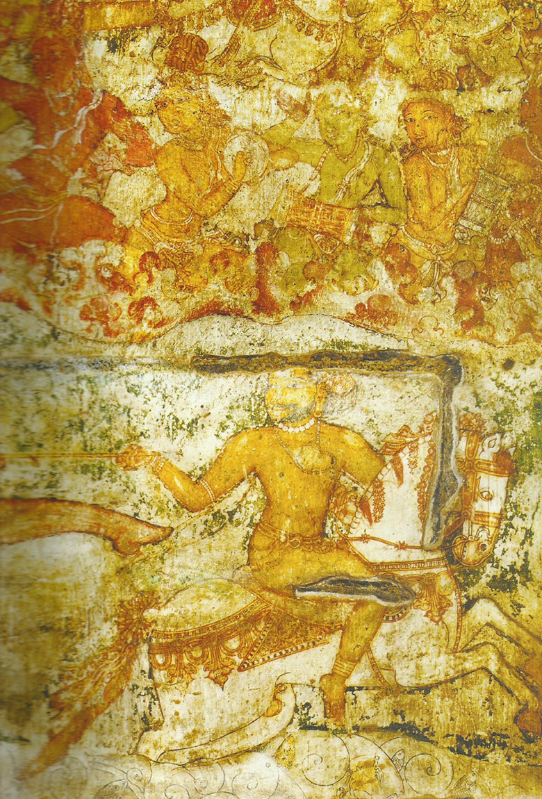 The ground floor walls of the circumambulatory path were once covered in frescoes depicting Rajaraja, as well as scenes from the Tripurantaka legend and Tamil Shaivite tales, integrating the Cholas into these older traditions.
