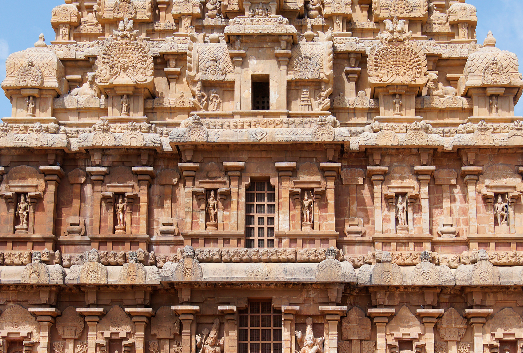 Owing to the then-unprecedented proportions of the vimana, the number of these shrines per tier is irregular, whereas they would typically reduce regularly in number. This same pattern is repeated on all four faces of the vimana on the outside.