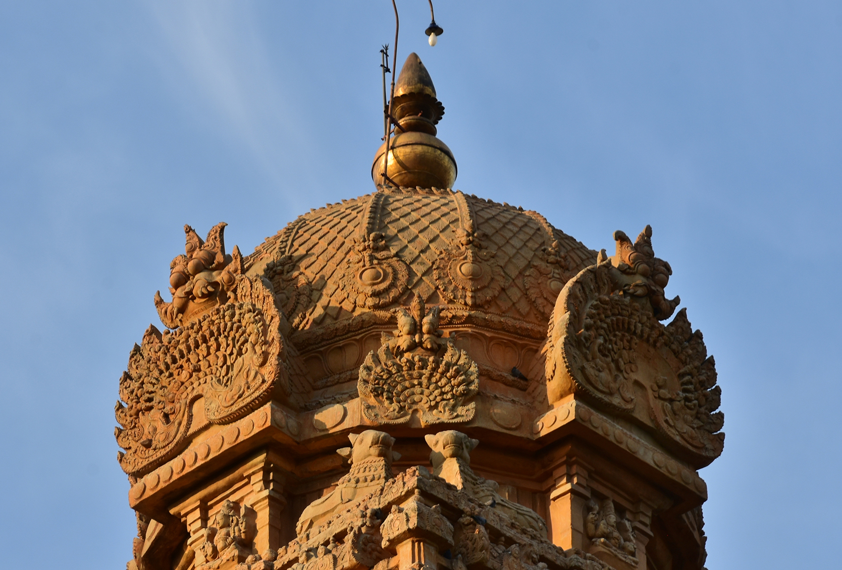 This second Rajarajan gopuram serves as a sculptural amuse-bouche before visitors step into the central complex. Even more intricately ornamented than the first Keralantakan gopuram, the lower tiers of the Rajarajan gopuram are crowded with carvings illustrating Puranic and Saivaite legends. The gateway is topped by a shala-type pavilion (a rectangular structure with a barrel-vaulted roof) with five stupis (decorative finials).