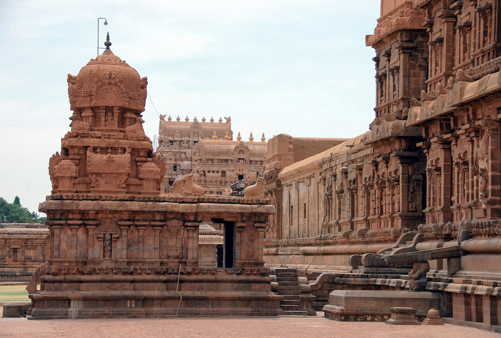 At the Rajarajeshvaram, the gopurams are significantly taller than those of older temples. But they still adhere to a clear spatial hierarchy that becomes apparent as you pass through the gopurams towards the towering vimana — the tallest and grandest structure of the complex.