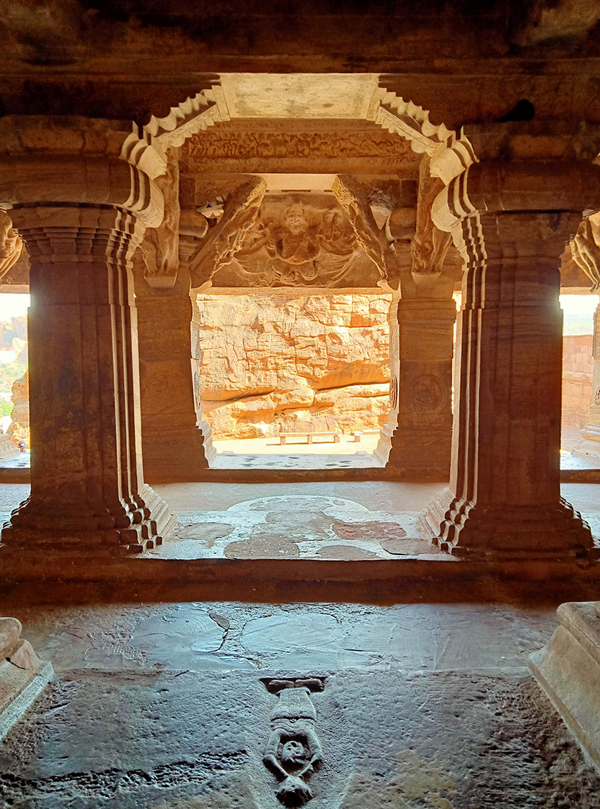 Beyond the ardha-mandapa lies a narrow, three-storeyed pillared passage that connects the mandapas to the main shrine. To set the main shrine–crowned by the vimana–apart as a distinct sacred space, separate from the worshippers’ realm–mandapas, this shallow recess was created in a slightly thinned out wall. This recessed link is known as a ‘false antarala’ or niskramana mandapa.