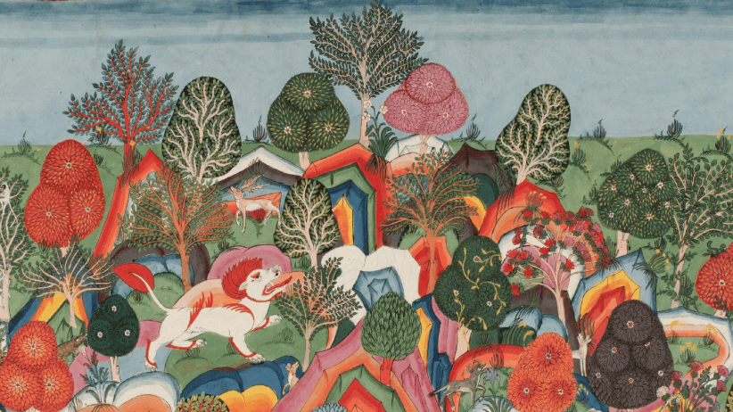 A Lion Kills Prasenajit in the Jungle; Early Shah Dynasty; Nepal; c. 1775; Opaque watercolor on paper; 48.3 x 64.1 cm. Courtesy Wikimedia Commons