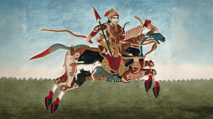 A warrior galloping on a horse whose body is formed from a variety of animals, including birds and fish; India; c. 1800–99; Gouache with pen and ink; 16.6 x 24.2 cm. Courtesy Wellcome Collection