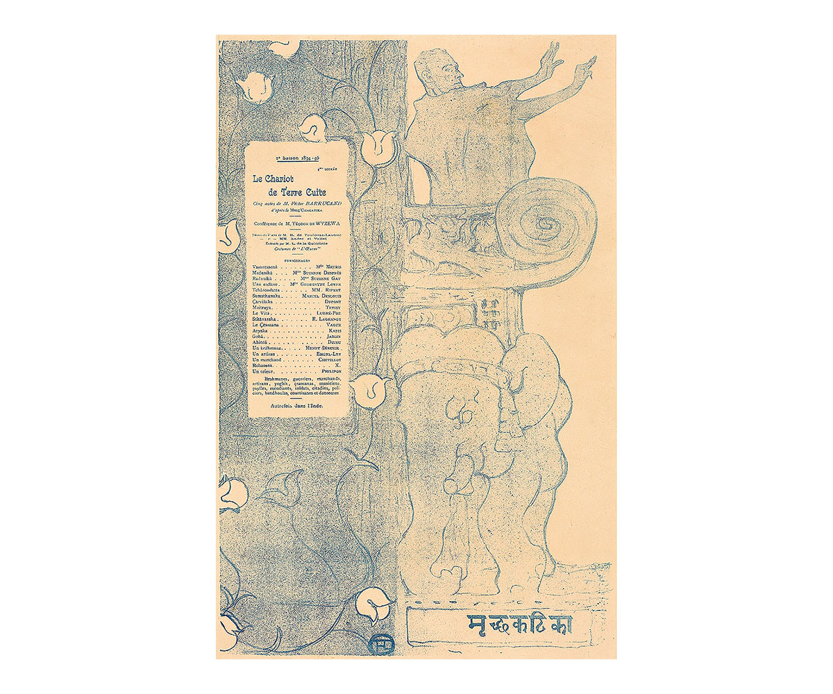 Along with themes of romance, class inequality and social hierarchies, the work also portrays a reckoning with tyrannical systems in the sub-plot, ending with the city’s autocratic ruler being overthrown by a shepherd. These themes echoed the sentiments of artists in nineteenth-century France, including Victor Barrucand, a journalist and writer known for his libertarian — sometimes anarchist — beliefs. In 1895, he adapted the play in French, as Le Chariot de Terre Cuite (The Terracotta Cart). The production was staged at the avant-garde Theatre de l’Oeuvre and was instrumental in spurring a series of European adaptations.