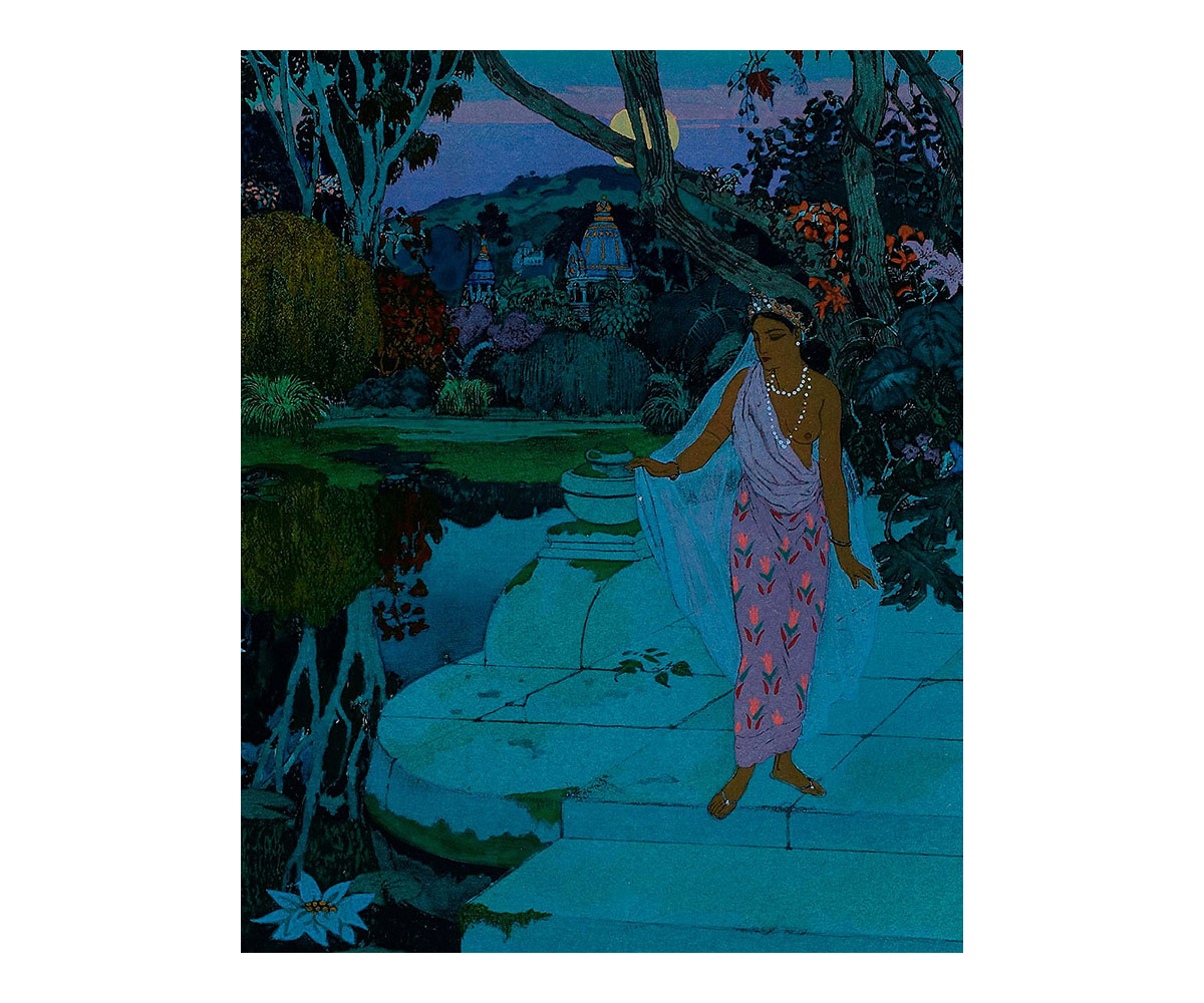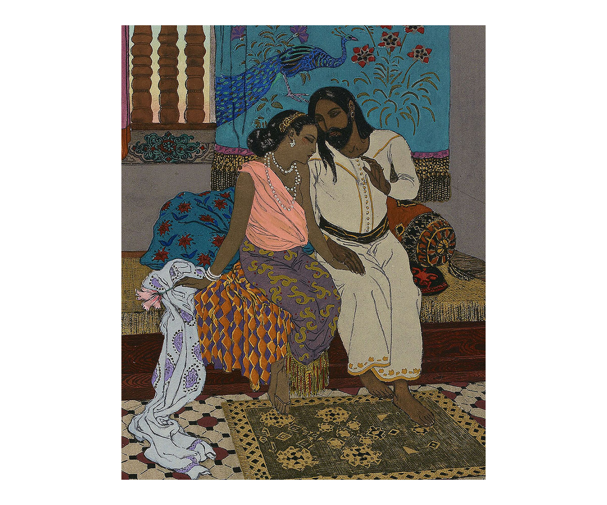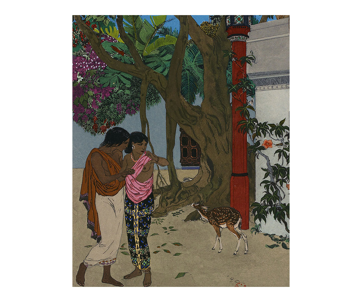 These visual tropes are also evident in the floral motifs of Lautrec’s playbill as well as in the vibrant illustrations made in a later publication of Le Chariot de Terre Cuite (1921) by the orientalist painter Léon Carré. Most renowned for his work on a 1929 French translation of The Arabian Nights, his illustrations for Le Chariot de Terre Cuite are rendered in vivid colours with highly stylised scenes that borrow heavily from orientalist imagery. They bring to mind the paintings of other French artists such as Paul Gauguin, whose paintings of Tahiti also deployed similar colour tones and compositions.