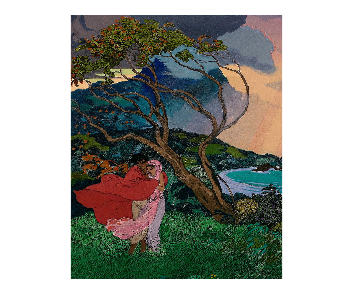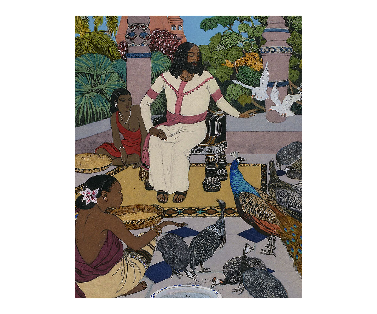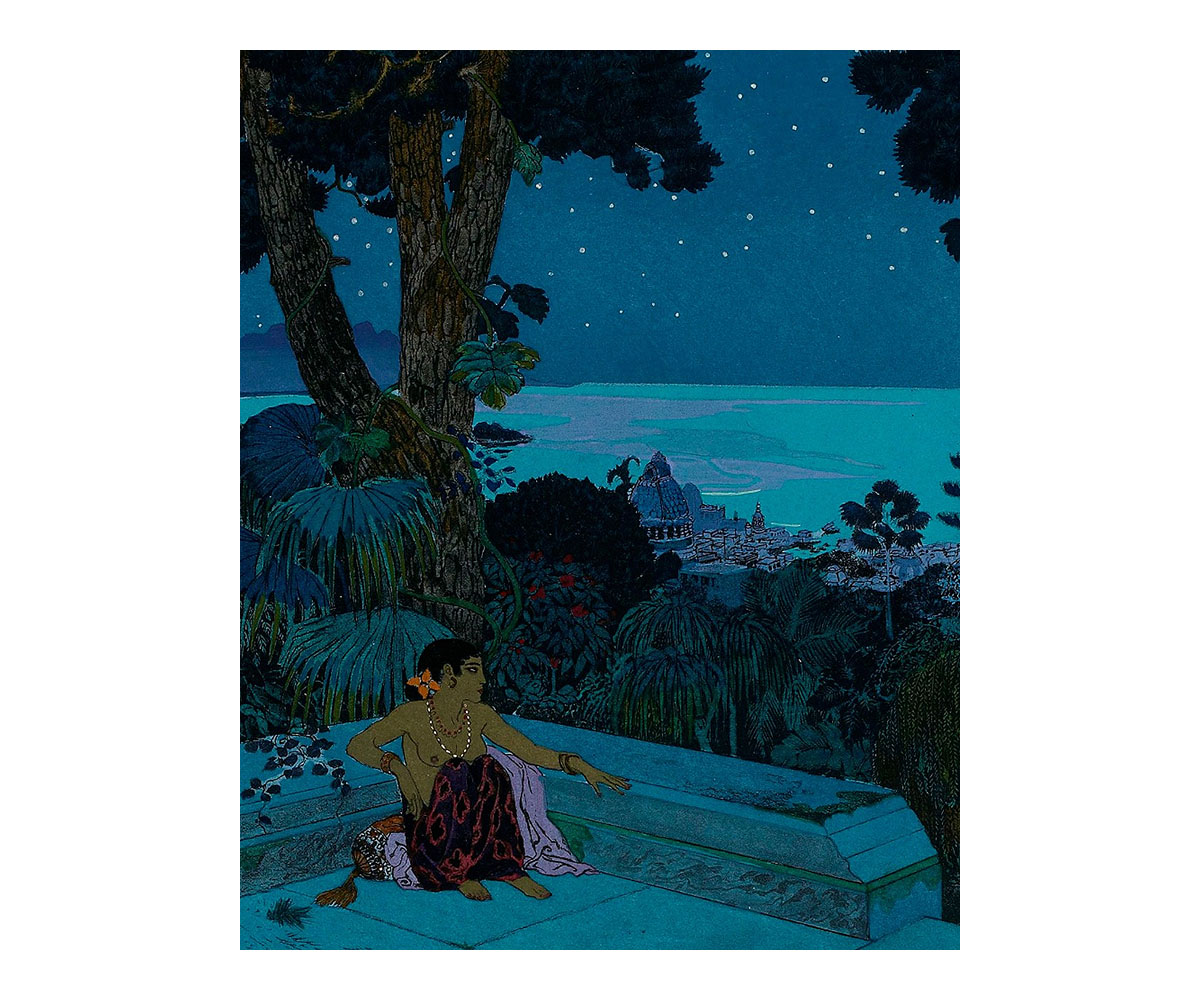 These visual tropes are also evident in the floral motifs of Lautrec’s playbill as well as in the vibrant illustrations made in a later publication of Le Chariot de Terre Cuite (1921) by the orientalist painter Léon Carré. Most renowned for his work on a 1929 French translation of The Arabian Nights, his illustrations for Le Chariot de Terre Cuite are rendered in vivid colours with highly stylised scenes that borrow heavily from orientalist imagery. They bring to mind the paintings of other French artists such as Paul Gauguin, whose paintings of Tahiti also deployed similar colour tones and compositions.
