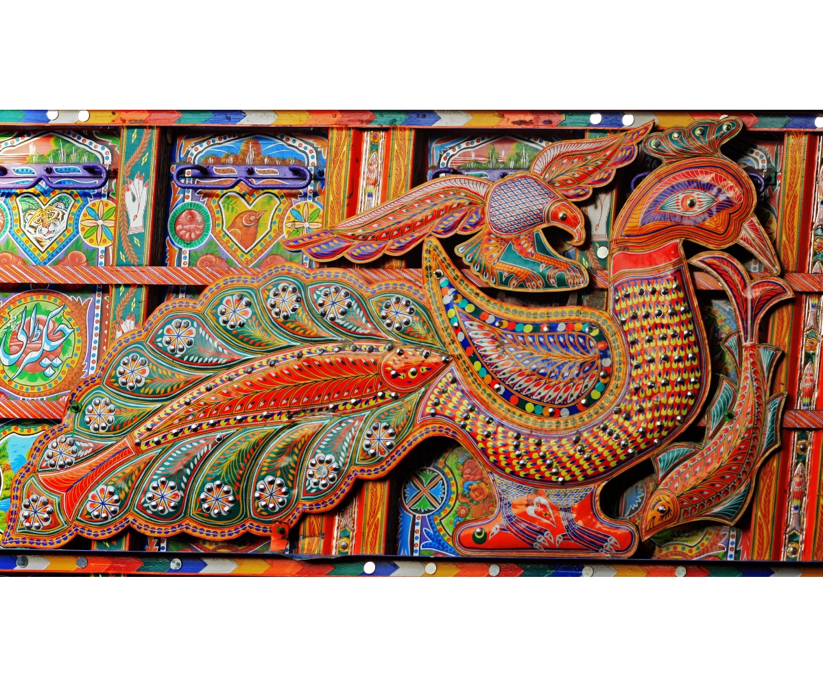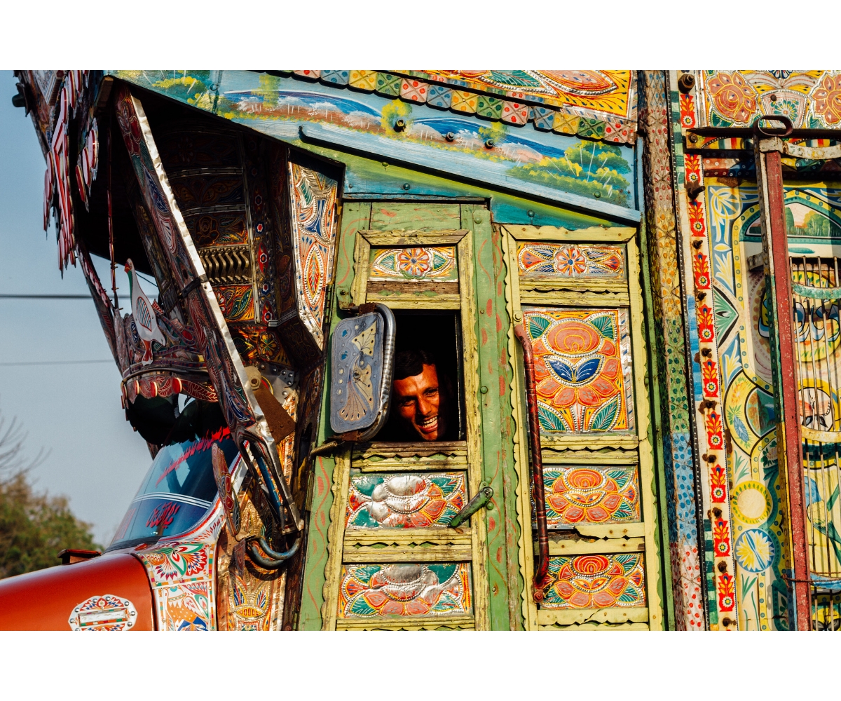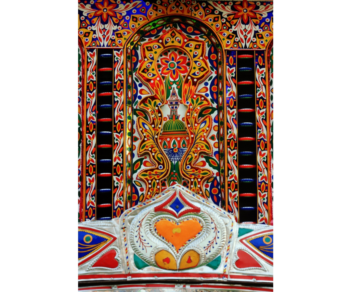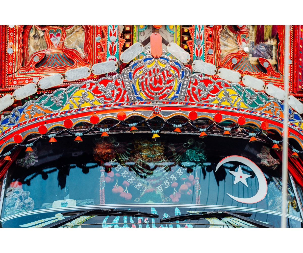 In 1920, Bedford trucks, made by a subsidiary of the British company General Motors, began selling in Pakistan (then part of undivided India). Soon after, these Bedford trucks were attached with the large wooden prows and metal bumpers that gave them their imposing and distinctive appearance. Gifted with extra space, Hindu, Sikh and Muslim truck drivers and owners in the region got to work and painted every inch of the truck with intricate designs, and religious iconography of gurus, saints, and gods. After Independence, with the formation of a new nation-state, truck art in Pakistan turned more patriotic, often acting as a device for the drivers and owners to pledge allegiance to their country and its political leaders.
