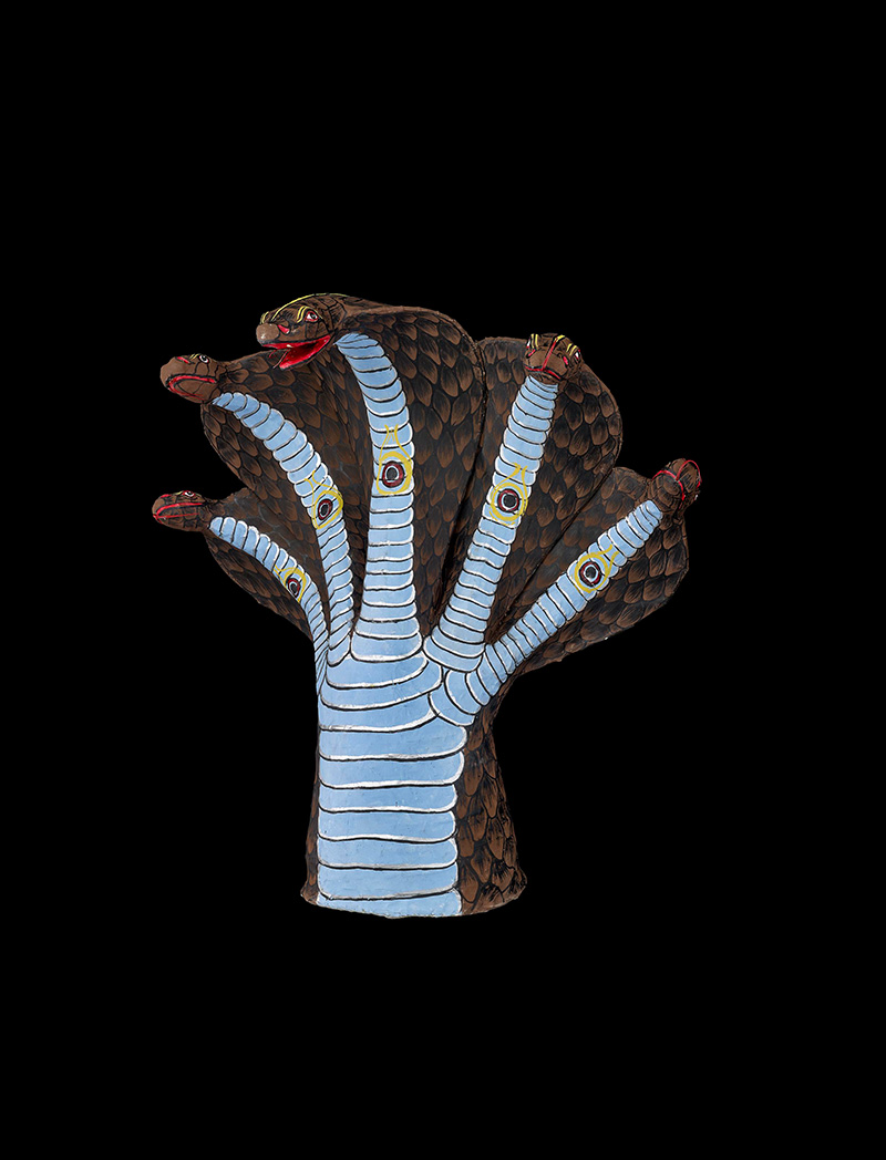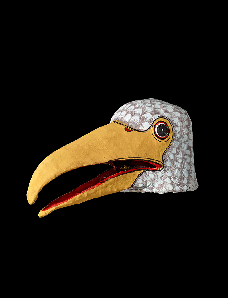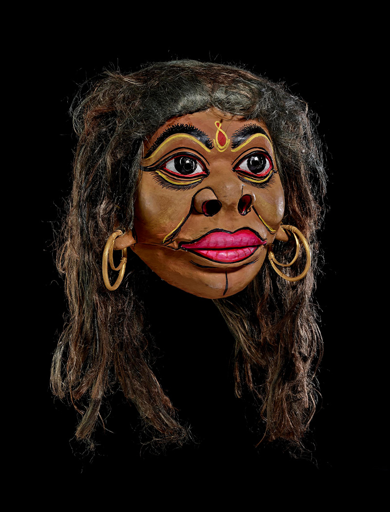 Historically, these masks were worn during bhaona, a form of folk theatre initiated by Shankardeva to bring stories from the Mahabharata, Ramayana and Bhagavat Purana to wider audiences. These performances were staged in naamghars (community prayer halls) with the masks helping to dramatise the performances and animate the characters within them. Two categories of masked figures, in particular, have been predominant: loukik (worldly figures), including humans and animals, and aloukik (supernatural figures), encompassing various fantastical figures such as demons, demigods and zoomorphs.