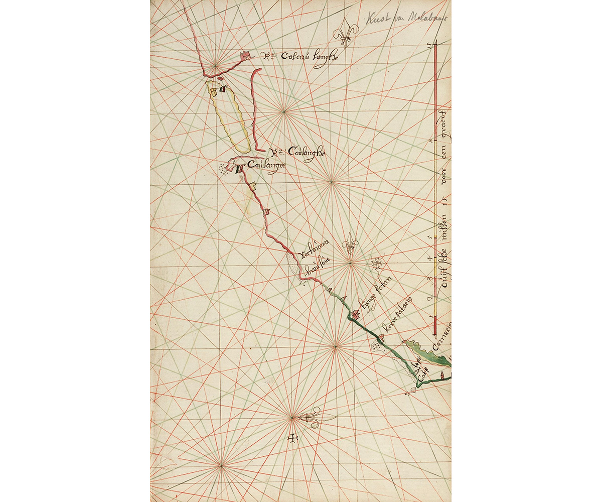 Map of the Malabar Coast from Rio Calcounghe to Cape Comorijn; c. 1667; Coloured drawing on paper; 19 x 31.5 cm; Wikimedia Commons