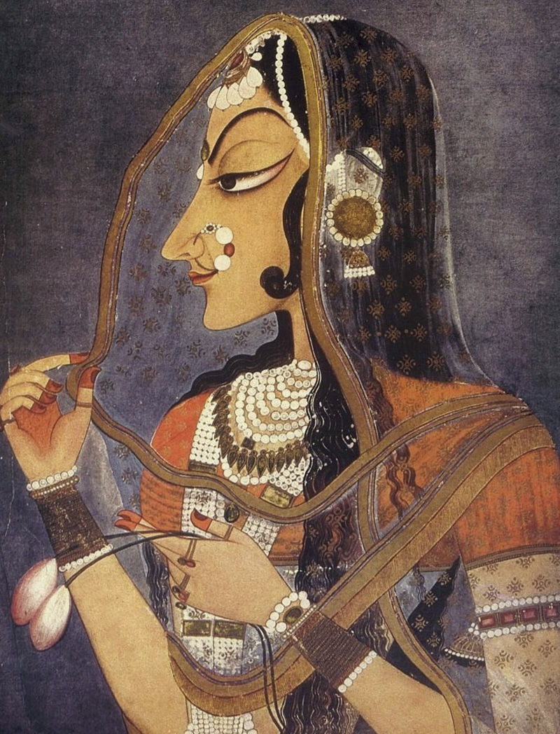 The women of Rajput courts were visible only to a few as they observed purdah (a custom of veiling) and lived in walled portions of Rajput palaces called zenanas. As a result, while the court painters produced men’s portraits in the hundreds, they left behind only a few records of women’s portraiture. However, according to Molly Aitken’s, Pardah and Portrayal (2002), while pardah was a serious hindrance to the portrayal of women, it was not an insurmountable obstacle. Not only did a notion of women’s portraiture exist, but Rajput women actively participated in its production as patrons, collectors and viewers of art.