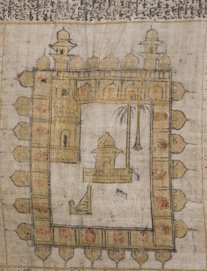 Talismanic Shirt with Depictions of the Two Holy Sanctuaries.; Mughal India or Deccan; 16th or early 17th century; Ink, coloured pigments and gold on cotton; 69 x 90 cm; The Khalili Collection