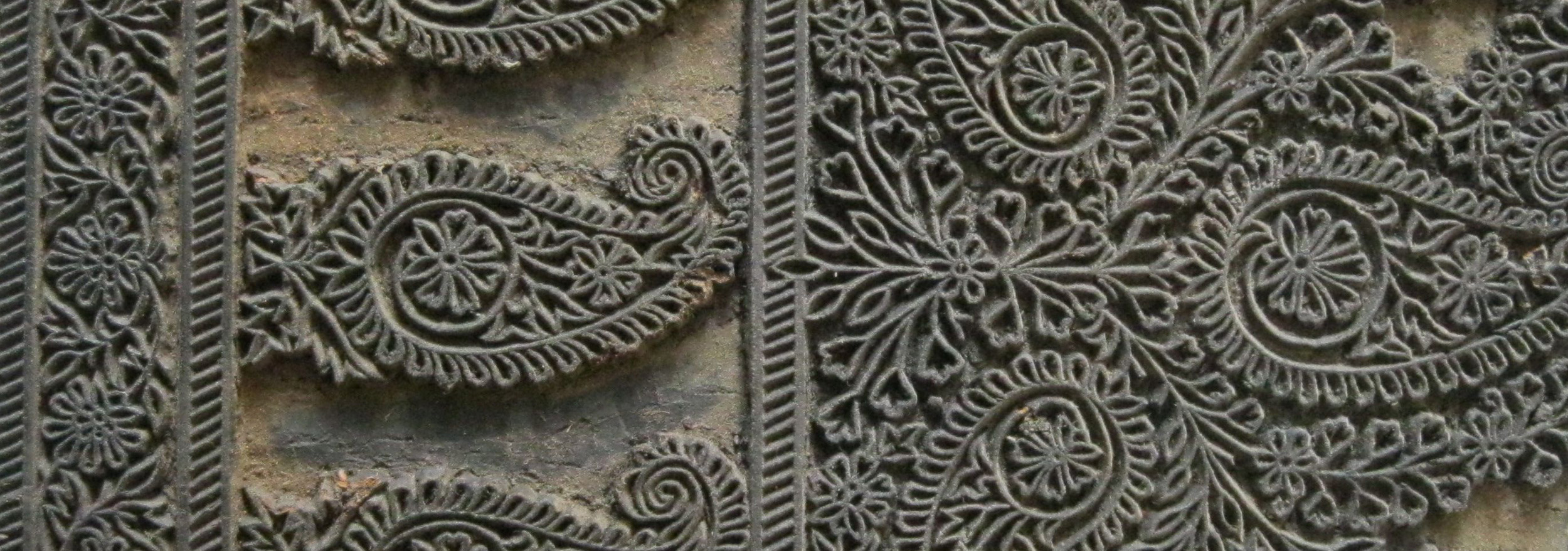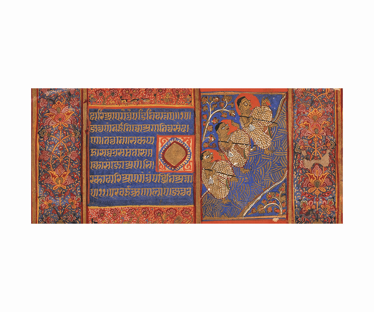 This can be discerned when one compares an older folio from c.1400 with an illustration from a Kalakacharya Katha manuscript from c. 1475, showing three monks fording a river. The latter exhibits Persian influences in its lavish use of gold paint instead of black ink in rendering the text, the application of ultramarine blue produced from precious lapis lazuli stones which replaces the erstwhile red ground and the addition of intricate, geometric floral patterns to the borders of the folios.