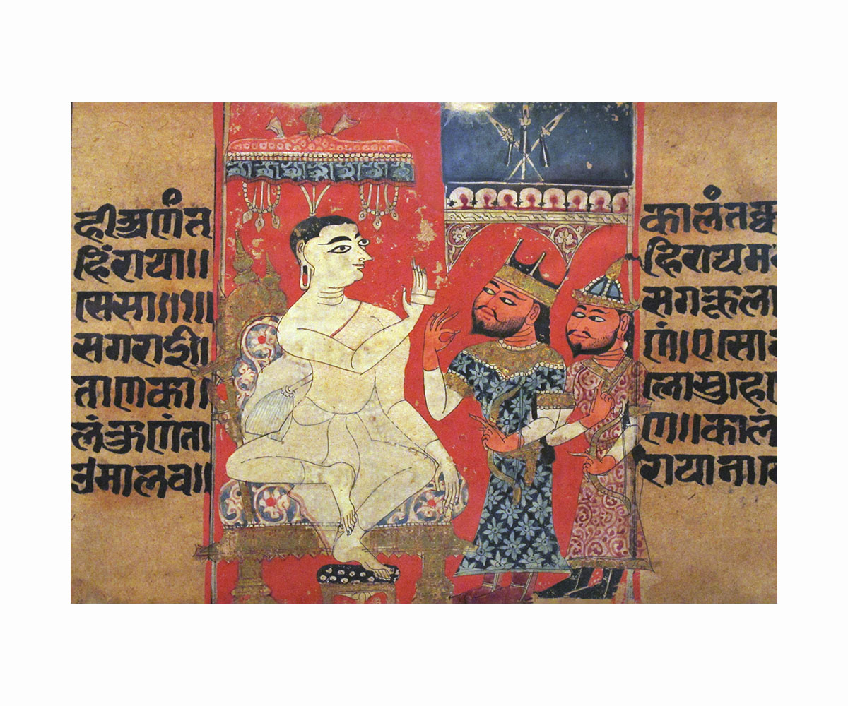 Written in the Prakrit language and set in 50 BCE, it recounts the mythical story of the Shvetambara monk Kalaka, whose sister — a beautiful nun of the Jain monastic order — is kidnapped by Gardabilla, the king of Ujjain, in present-day western Madhya Pradesh. Turned away by local kings and princes, the monk, famous for his miraculous powers, enlisted the help of ninety-six princes of the Saka clan — possibly Scythians, a population of nomadic people originally from Iran and recorded in textual histories from as early as the 9th century BCE — who crossed the Indus river to help him defeat his enemy.