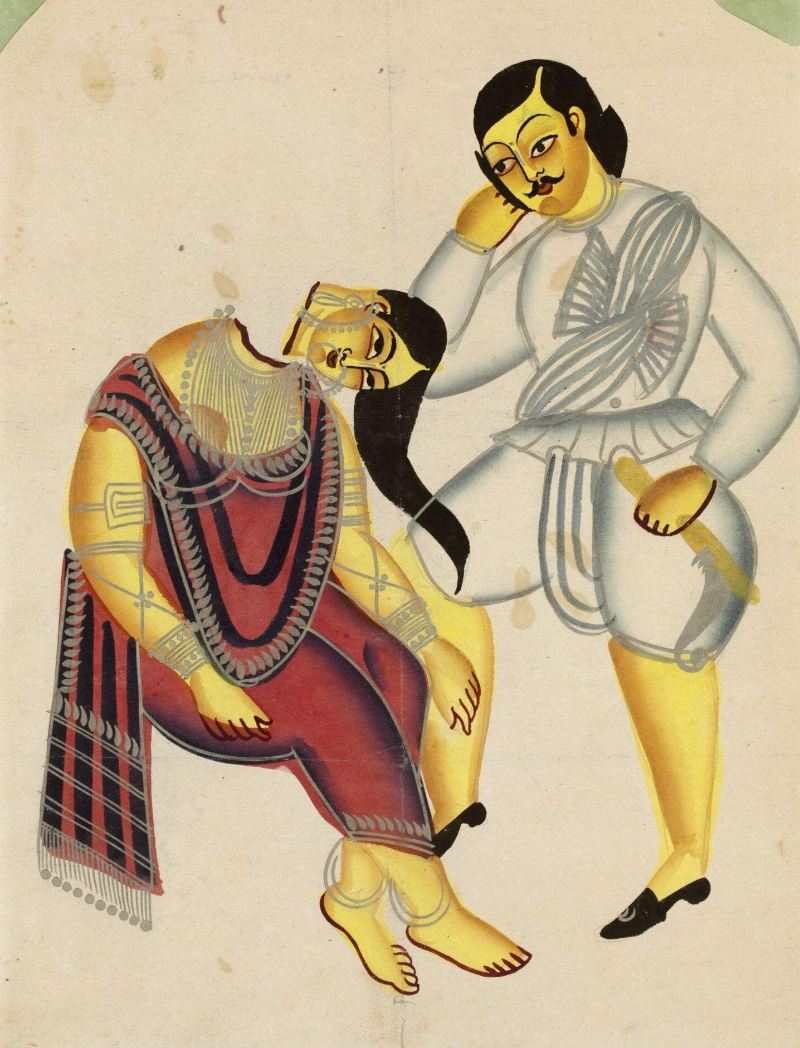 Jealous husband Nabin about to deliver the fatal blow to wife Elokeshi (detail); Kalighat, Kolkata, Undivided Bengal; 1890; Watercolour and tin alloy on paper. Courtesy Victoria and Albert Museum