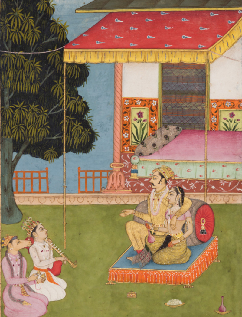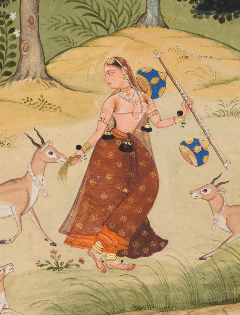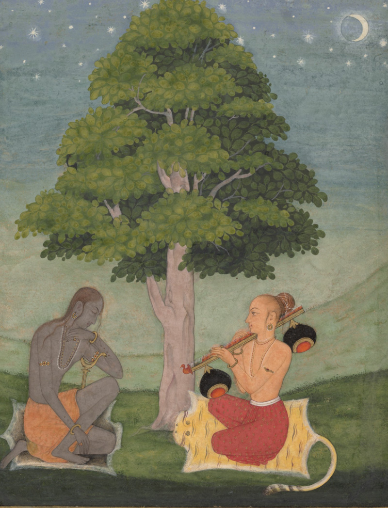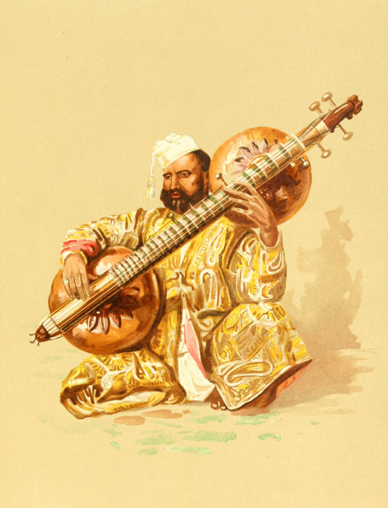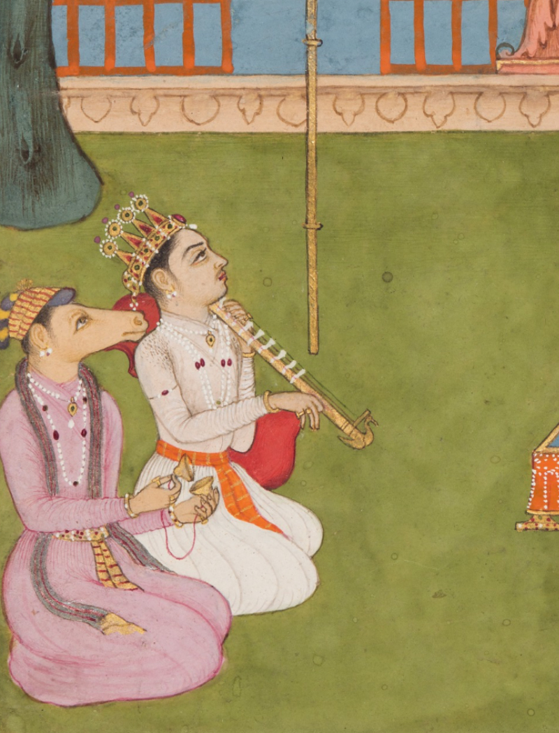 An ancient musical instrument, Rudra veena has appeared most popularly in numerous ragamala paintings, where both men and women are shown playing the instrument. A stick zither belonging to the greater family of veena and associated with the Dhrupad genre of Hindustani classical music, Rudra veena originated in northern India and is named after the Hindu god Shiva, who is also known as Rudra. Some believe that the mythological king of Lanka, Ravana, built this veena to pay homage to his beloved deity and named it after him. Another story posits that Shiva himself created the instrument, inspired by the beauty of Parvati, his consort.