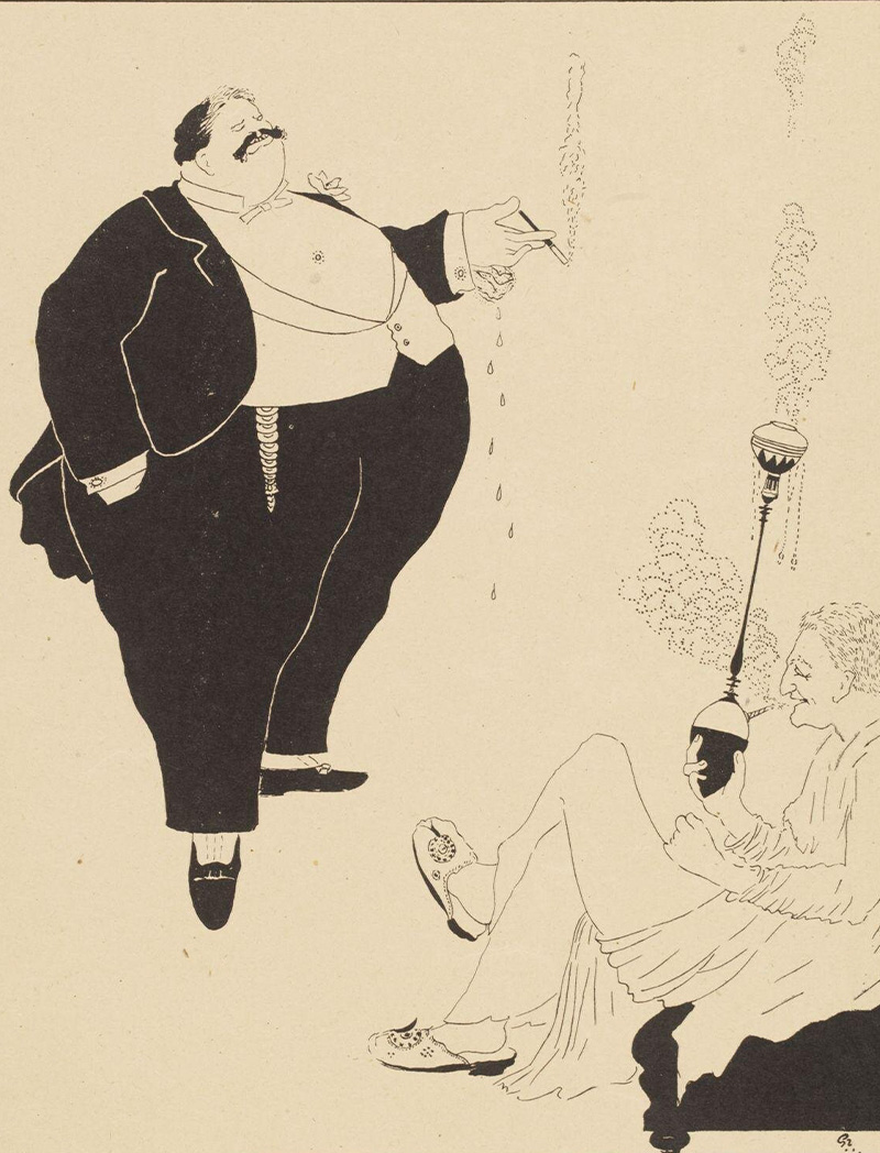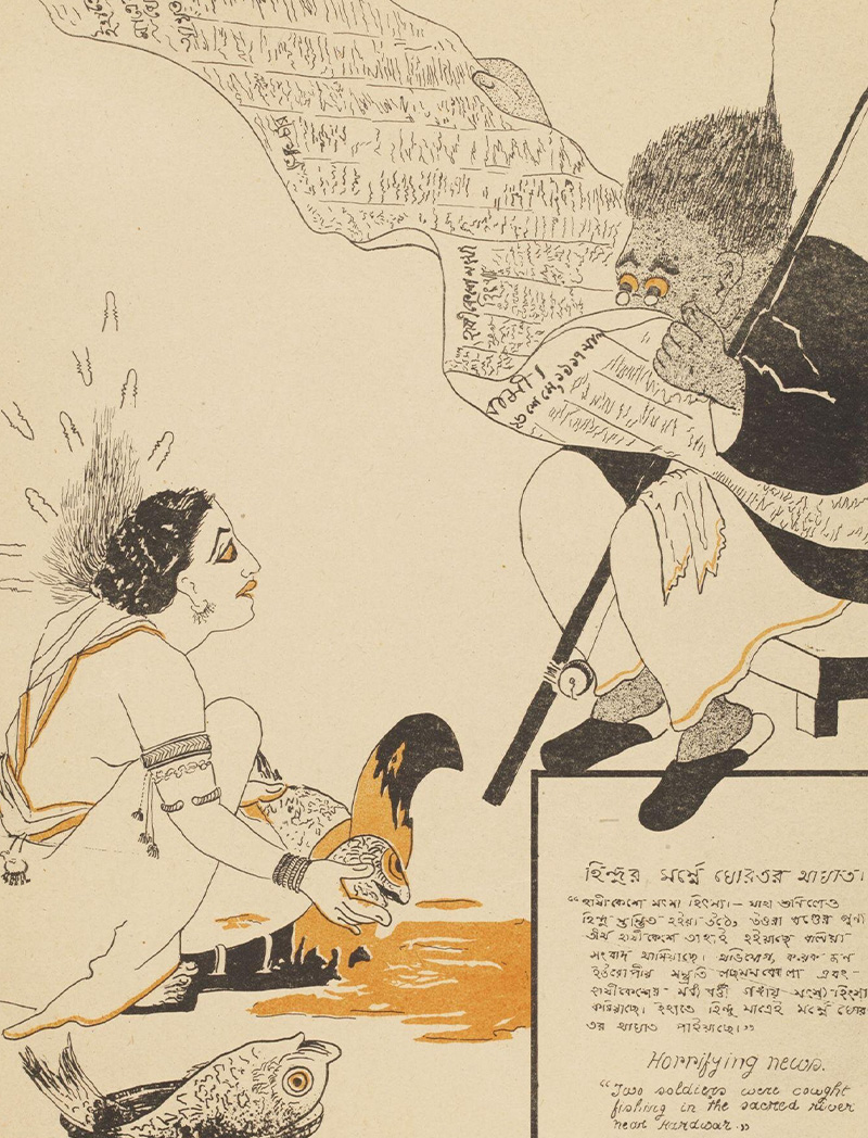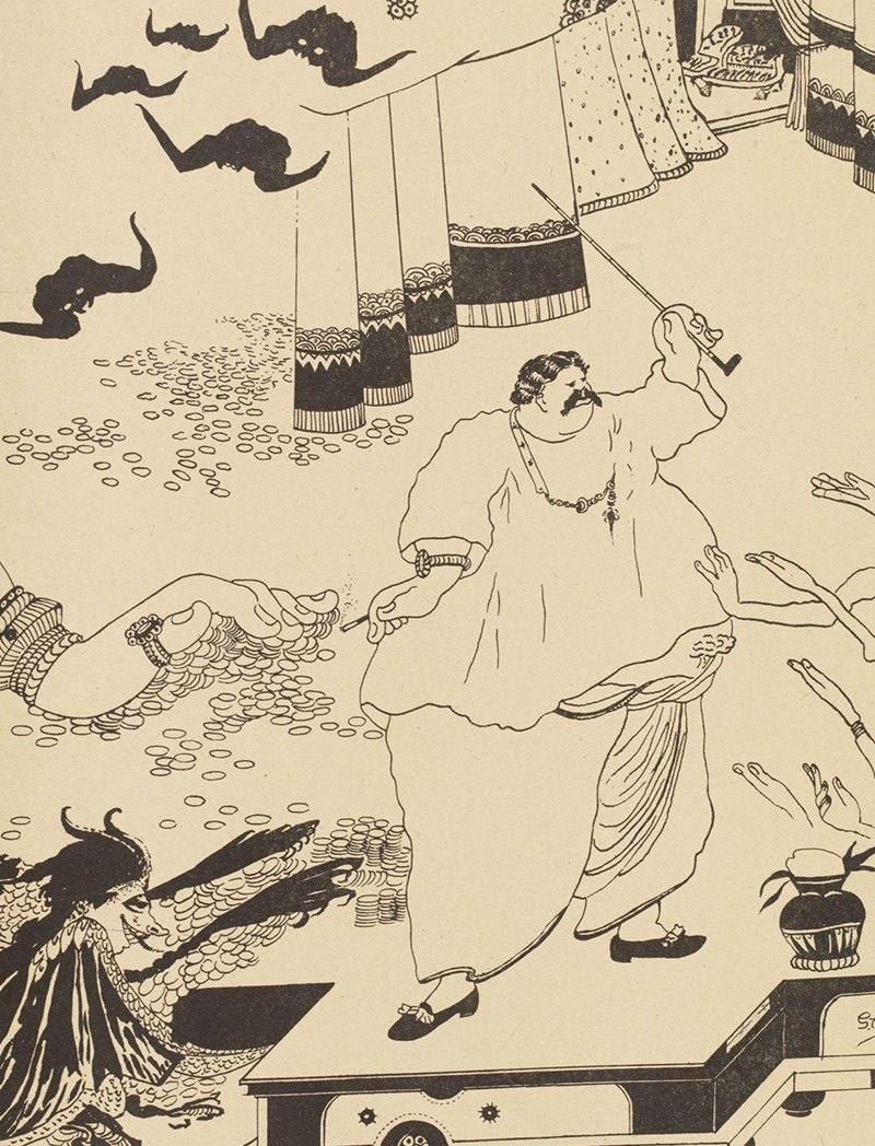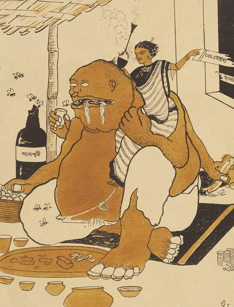Drawn and painted between 1915–21, using mostly black ink strokes, Gaganendranath Tagore’s caricatures skewered the hedonistic lifestyles of the nouveau-riche and emerging middle class of Bengal, directing special attention to the figures of the anglicised Babu and Brahmin priests. His social commentary was held up by the wit and simplicity of his visual idiom. Rendered in watercolour, his caricatures were transformed into lithographic prints by the in-house lithograph machine of the Jorasanko-based Bichitra Club — where experiments in craft, architecture, stage decoration, and design were being pursued — and became public.