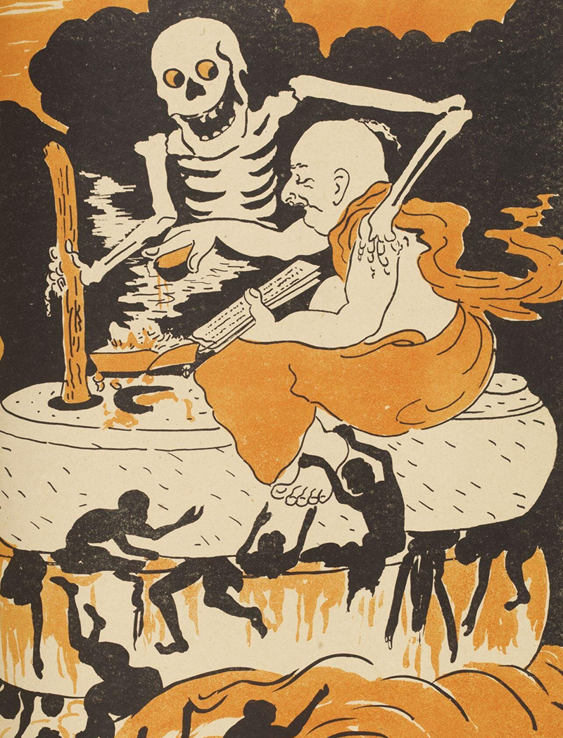 In the painting Purification by Cow Dung (1917), the priest is the subject of ire as he squashes a bed of flowers with a thick layer of cow dung which is considered holy. In a more sombre scene in Millstone of the Caste System (1917), the Brahmin is accompanied by a menacing skeleton in crushing a nondescript mass of people. Tagore was active as an actor and a stage designer and his interest in the comedic melded with his painter’s vision, leading to the production of three portfolios — Virupa Vajra (Strange Thunderbolts, 1917), Adbhut Lok (The Realm of the Absurd, 1917) and Nava Hullod (New Tumult, 1921).