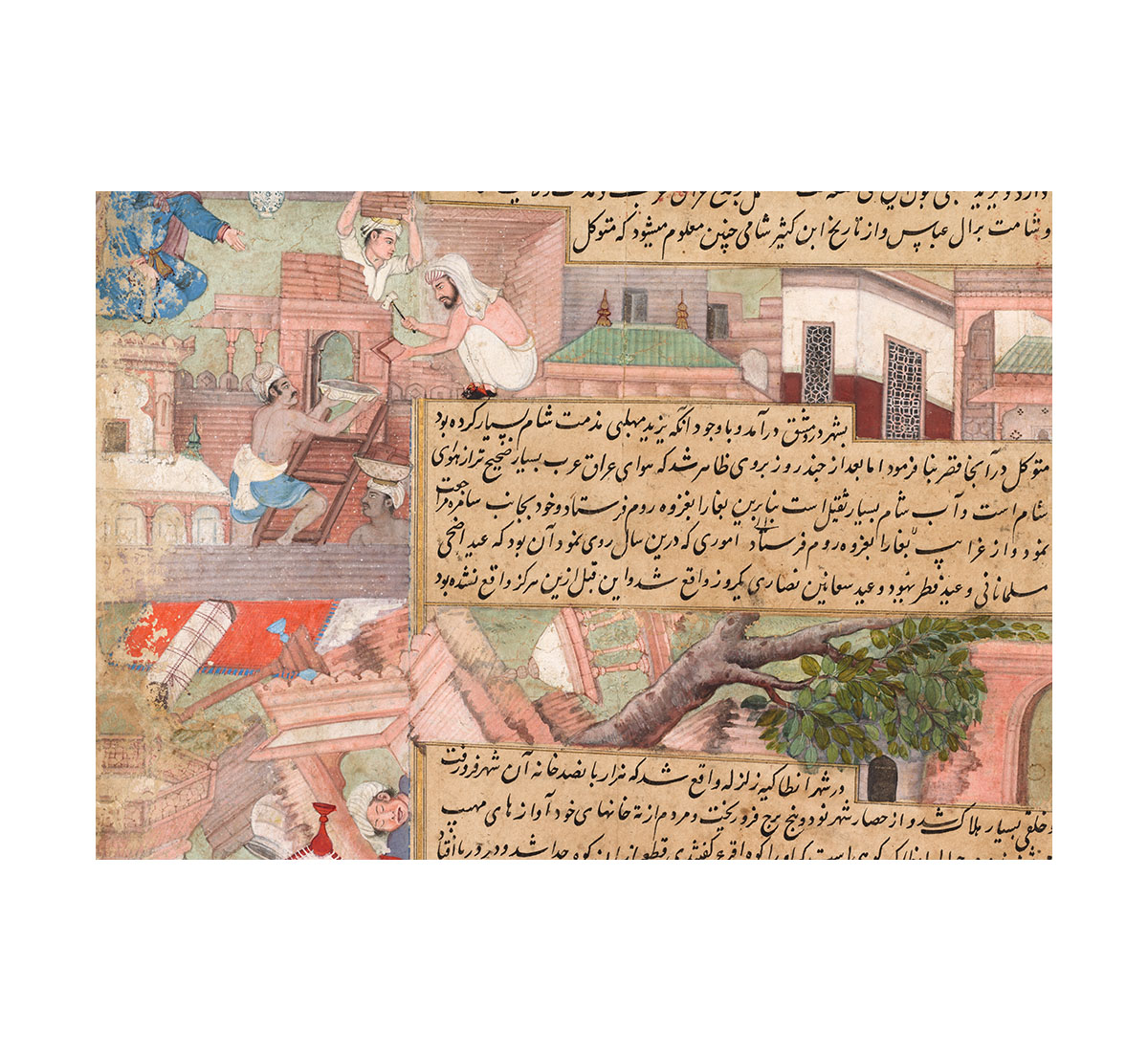 The Tarikh is by no means a comprehensive history, or even — strictly speaking — a history in the modern sense. It instead develops a theory of just and pluralistic kingship. It argues for the concentration of authority in the hands of a single enlightened ruler, reducing the power of the clergy, and providing a historical justification for Akbar’s pluralistic policies. The disasters depicted in this manuscript page are an example of how the Tarikh does so. The text describes a series of events from the ninth century, the third century of the Islamic calendar, when the Abbasid Caliph Al-Mutawakkil, known for his persecution of Zoroastrians, Jews and Christians, was in power. During his reign, Egypt faced deadly hailstorms, and Syria was hit by earthquakes that sent tremors as far as Iraq and destroyed multiple cities. These disasters, the Tarikh suggests, were a consequence of the Caliph’s religious intolerance, for such bigotry was a violation of the sacred duties of Islamic kingship.