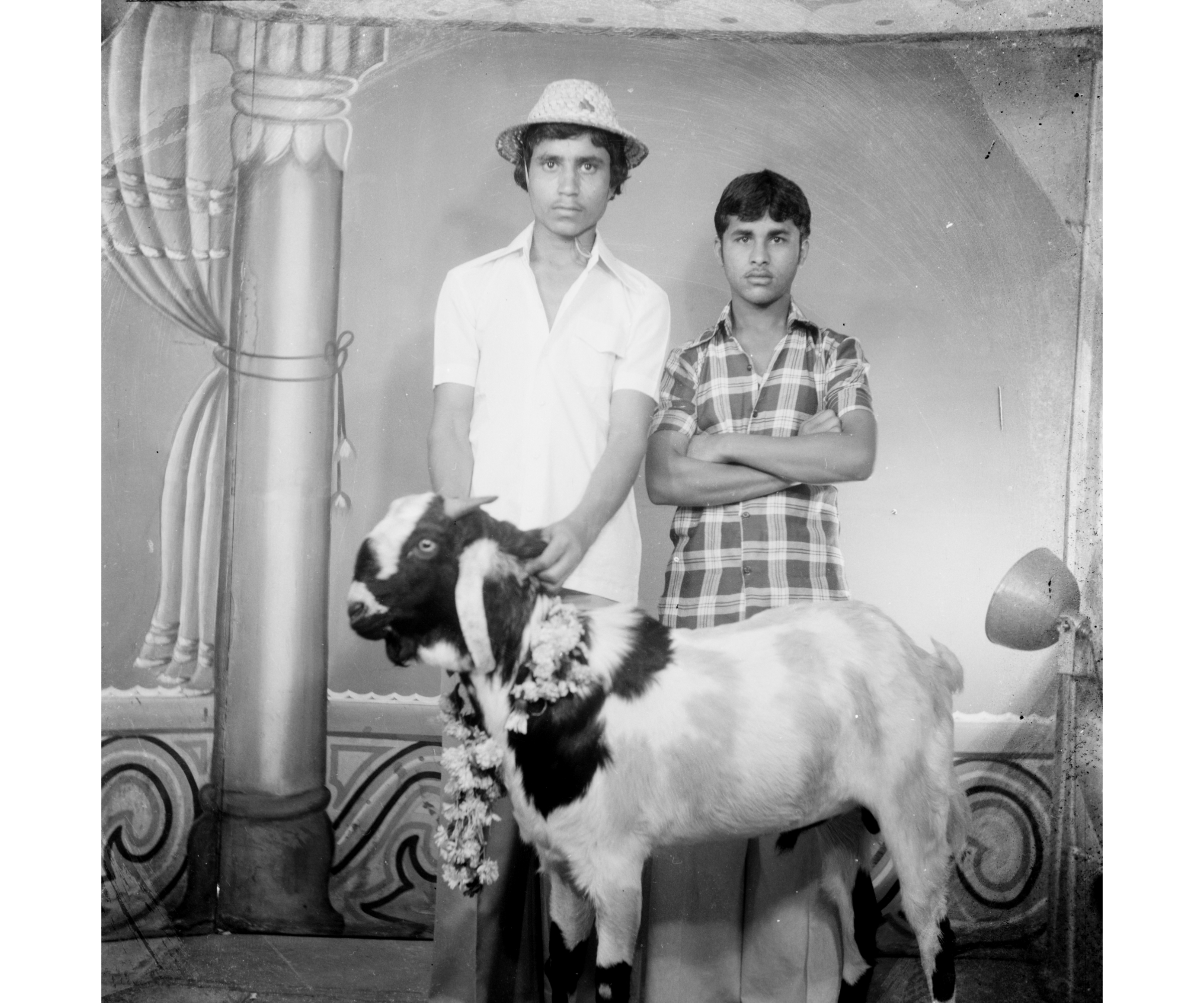 For Nagda’s Muslim families, the celebrations associated with Eid would also occasion a visit to the studio. In one portrait made in the mid 1980s during Bakrid, two boys had a portrait made alongside their family’s decorated sacrificial goat in an effort to preserve the memory. As Punjabi anticipated, wedding and family albums were big drivers of business, especially during the auspicious seasons spread out between September and February. Prior to the advent of digital image exchange, physical photographs played a significant role as currency in the social world of matrimony, comprising stylish formal portraits aimed at acquiring marriage proposals, wedding-day portraits as well as more casual family portraits made for posterity.