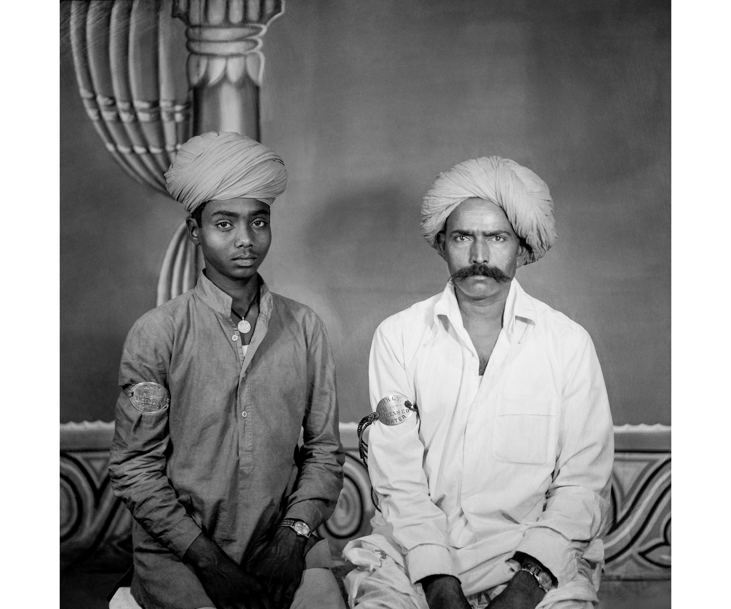 For one portrait, Punjabi photographed a train porter, Behru Singh, alongside his son Laxman. Although the portrait was not made for a strictly administrative purpose, both father and son are wearing their copper armbands, an instantly recognisable component of the Indian porter’s uniform. The existence of the armbands opens up a number of possible interpretations. It may signal the sitters’ desire to be seen through the generational integrity of their vocation, or possible evidence of a quick portrait made in uniform after a long day’s work. There also exists another possibility: Amitabh Bachchan’s portrayal of a Mumbai train porter as a working-class hero in the movie Coolie (1983) had helped lend a degree of cultural capital to the porter’s uniform, which signaled a broader class solidarity through which Behru and Laxman Singh may too have felt seen.