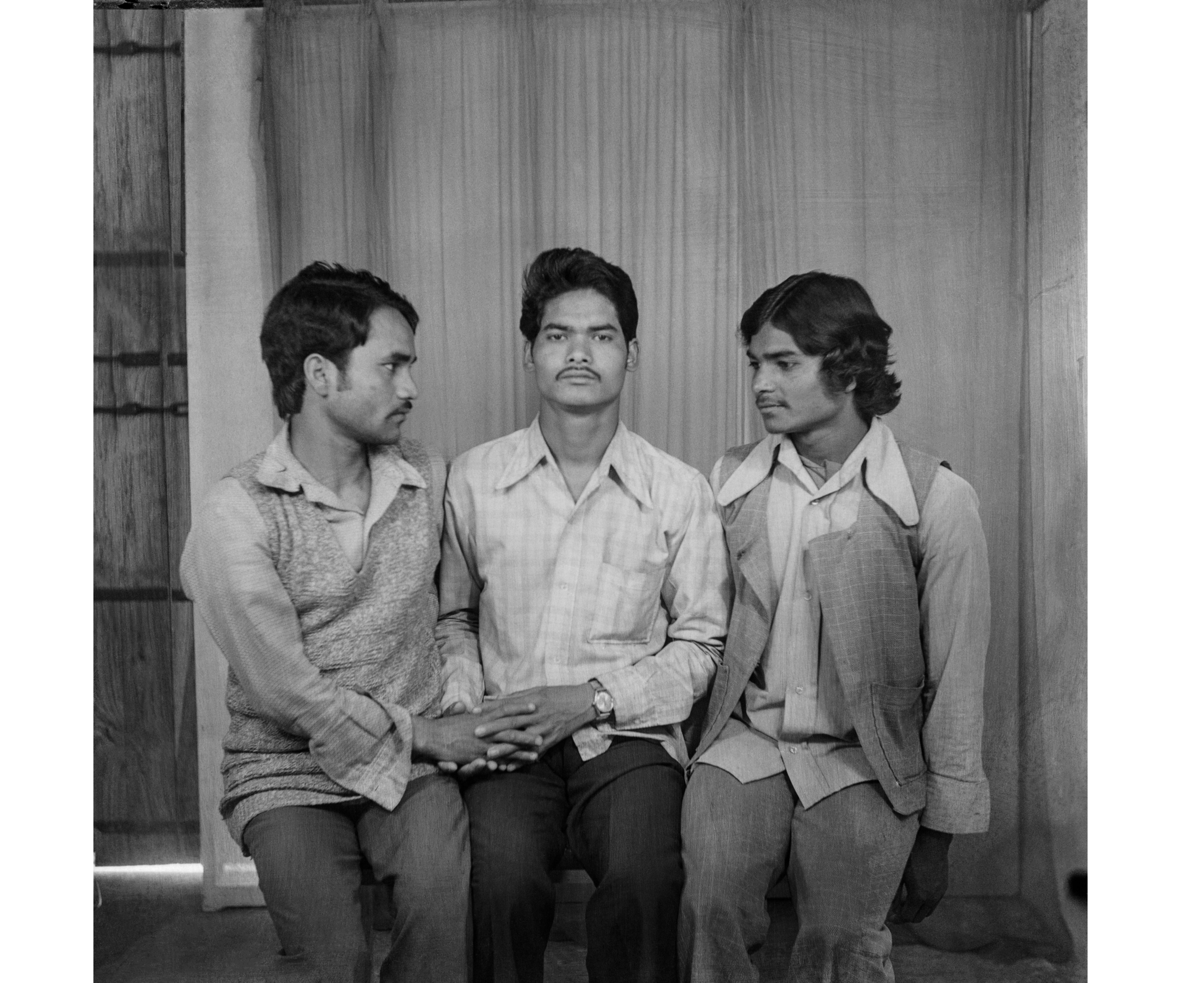 Like in many other portraits by Punjabi, objects such as the copper armband allowed people to bring a range of cultural references and sociopolitical attitudes into the photographic space. In contrast, looking at another group portrait Punjabi made of three friends, what the photograph expresses isn’t so much a social ideology but the intensities of personal relationships.