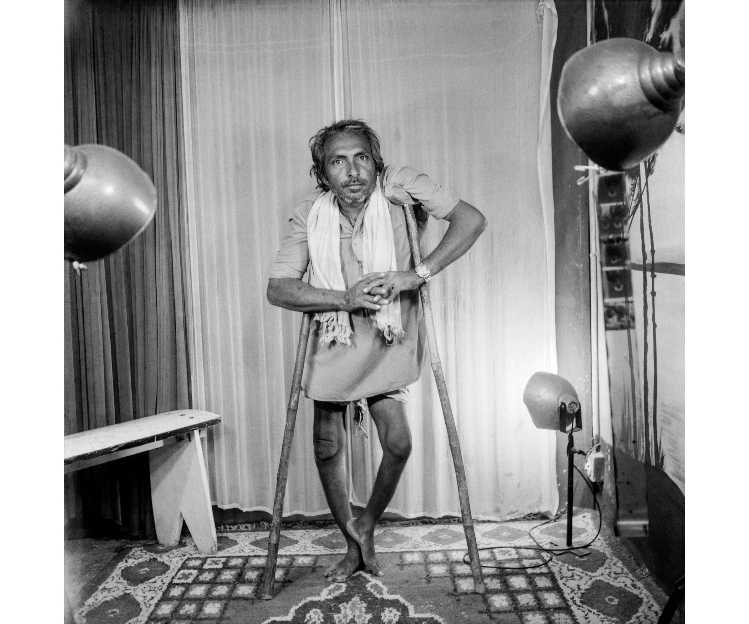 One photograph shows a man with a physical disability propping himself up with two crutches. Punjabi recalls that he came into his studio and insisted on a full-length portrait that would allow him to qualify for disability entitlements. In such cases, Punjabi’s camera didn’t simply ‘see’ but also created conditions for formal and bureaucratic forms of recognition, making the studio not just a space of aesthetic possibility but also one crucial to postcolonial India’s administrative design, where photographic evidence was central to formal citizenship. Though tightly standardised in their visual language, the sheer diversity of faces captured in these images also subverts the ‘governable’ uniformity demanded by a rapidly modernising nation.